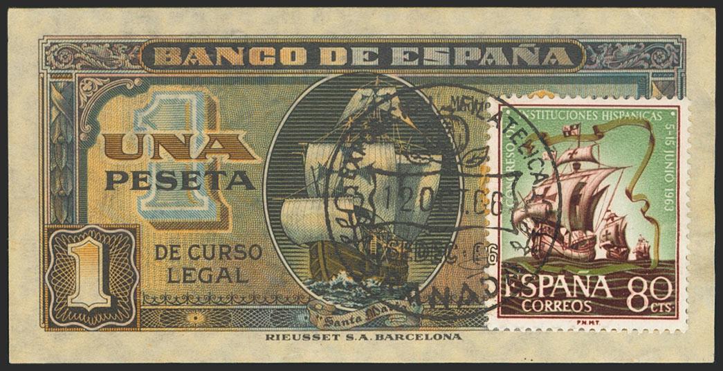 English 1 peseta. September 4, 1940. Series C, franked with a stamp also with the theme Nao Santa María. (Edifil 2021: 442a). Original sizing. Uncirculated.