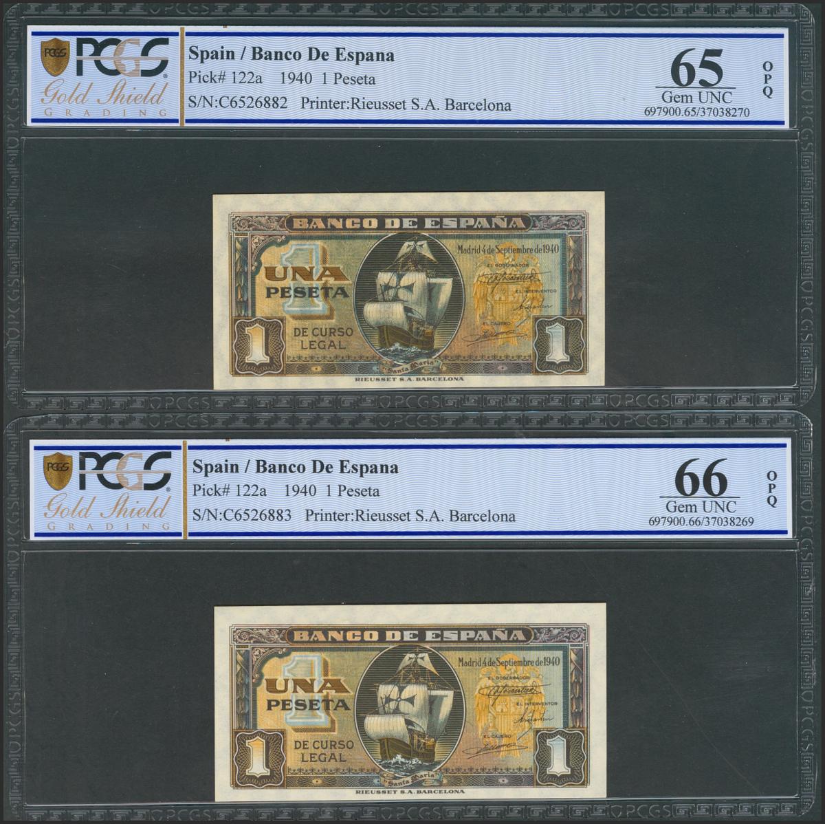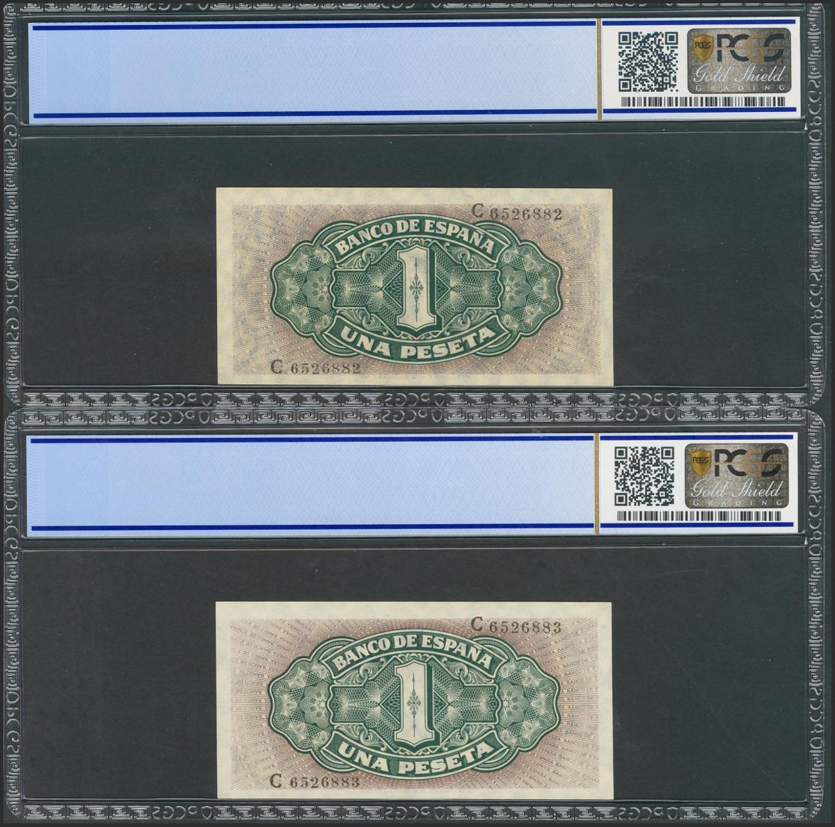 1 peseta. September 4, 1940. Correlative pair. Series C. (Edifil 2021: 442a). Original sizing. Uncirculated. Encapsulated PCGS65OPQ / 66OPQ.