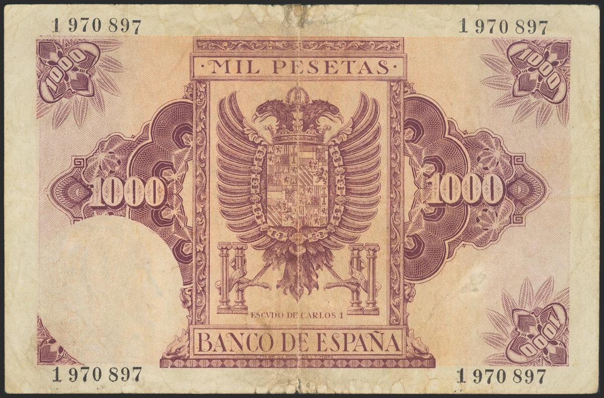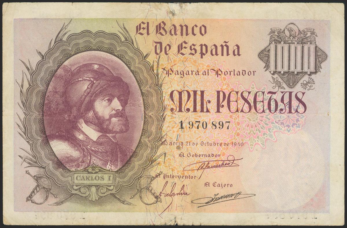 1000 Pesetas. October 21, 1940. Without series. (Pick: 125a, Edifil: 445). Unprofessional restoration in the upper margin. Good Fine.