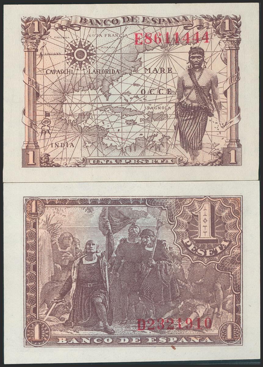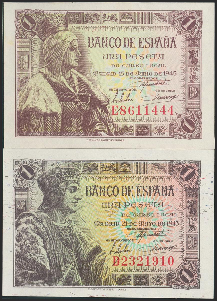 Set of 2 1 Peseta banknotes issued on June 15, 1945 and May 21, 1943 and with series E and D, respectively (Edifil 2017: 447a, 448a). Uncirculated.