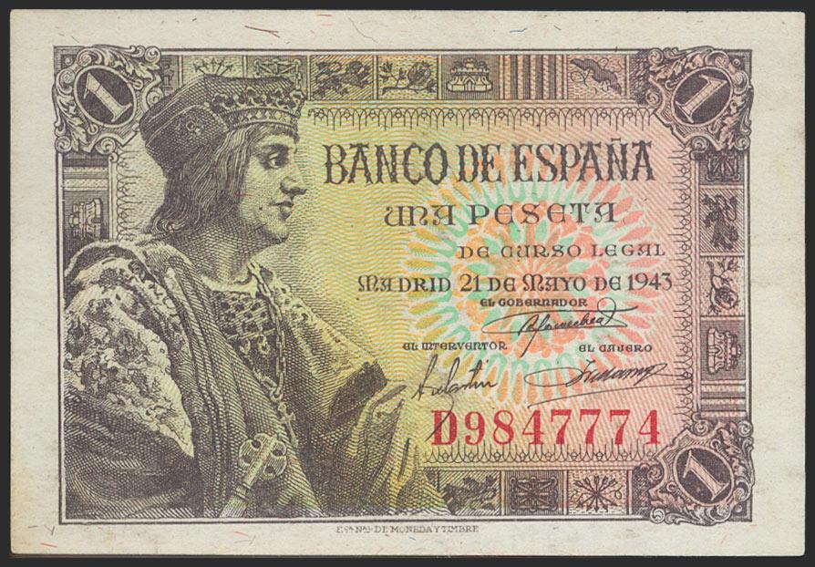 1 peseta. May 21, 1943. Series D. (Edifil 2021: 447a). Original sizing. Uncirculated.