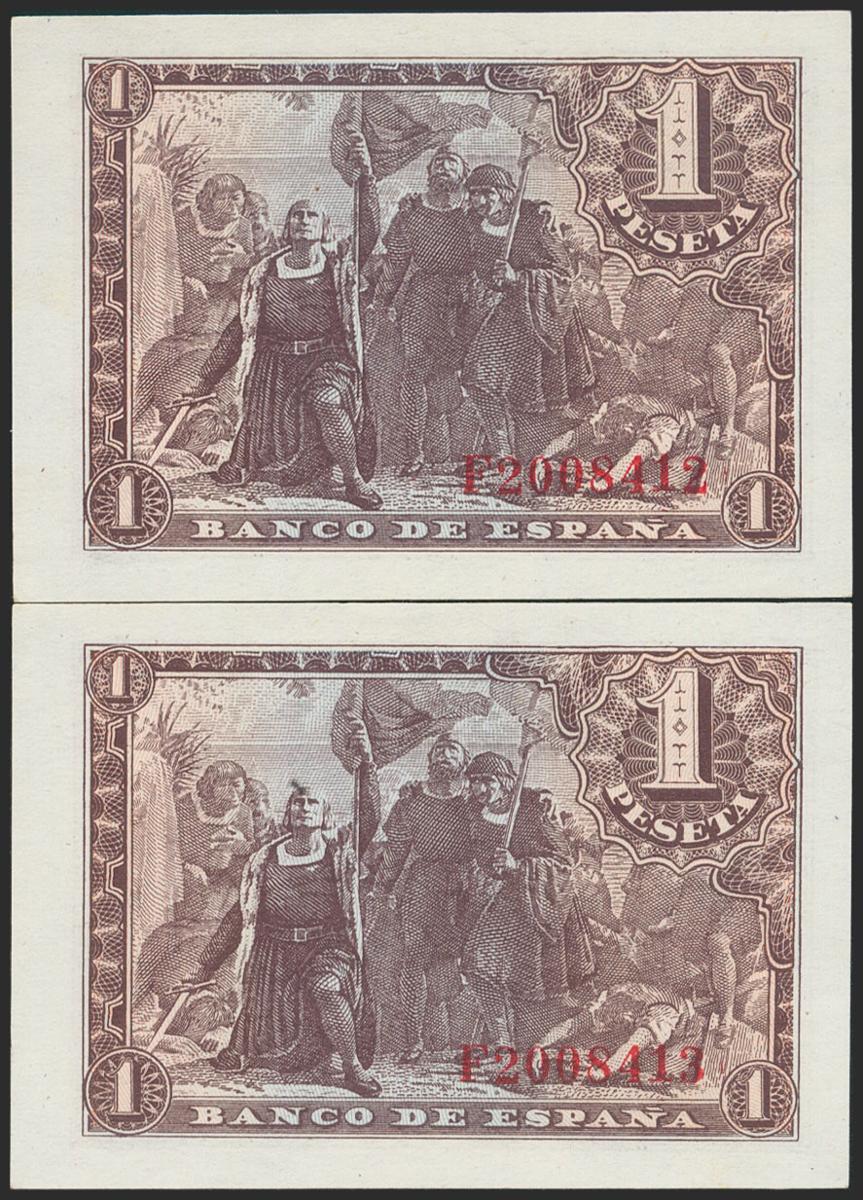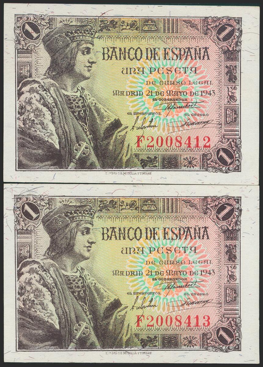 1 peseta. May 21, 1943. Correlative pair. Series F. (Edifil 2021: 447a). Original sizing. Uncirculated.