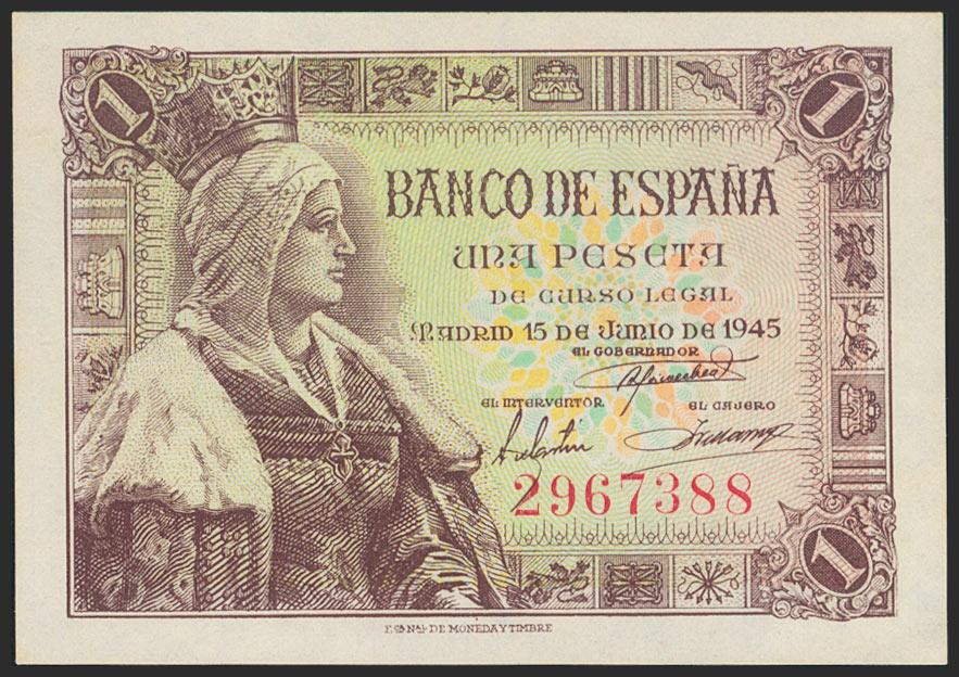 1 peseta. June 15, 1945. Without series. (Edifil 2021: 448). Almost Uncirculated.