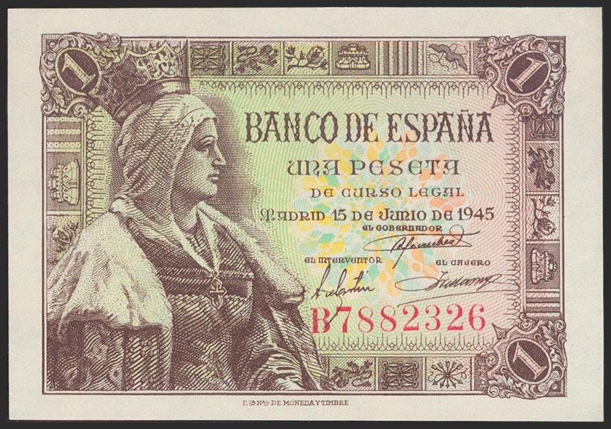 1 peseta. June 15, 1945. Series B. (Edifil 2021: 448a). Uncirculated.