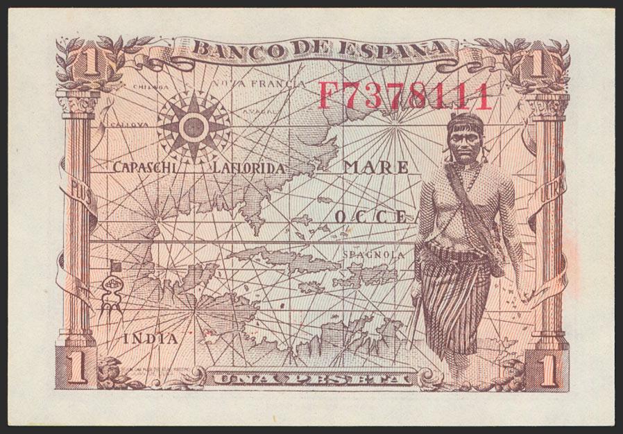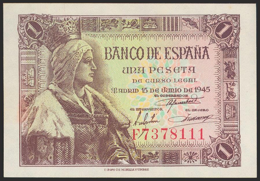 1 peseta. June 15, 1945. Series F. (Edifil 2021: 448a). Retains much of the original size. Good Extremely Fine.