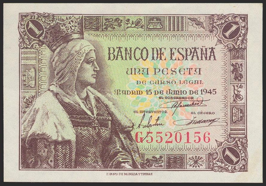 1 peseta. June 15, 1945. Series G. (Edifil 2021: 448a). Original sizing. Uncirculated.