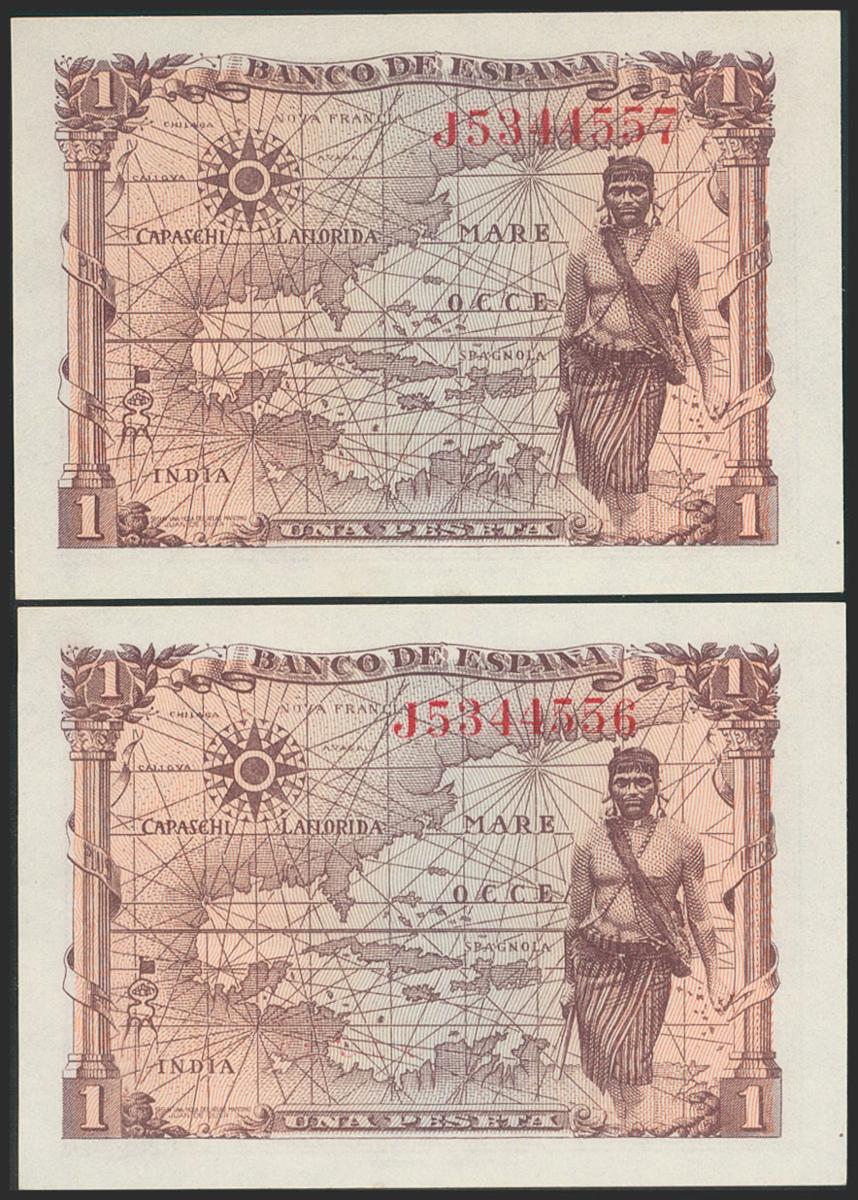 English 1 peseta. June 15, 1945. Correlative couple. Series J. (Edifil 2021: 448a). Original sizing. Uncirculated/ Almost Uncirculated.