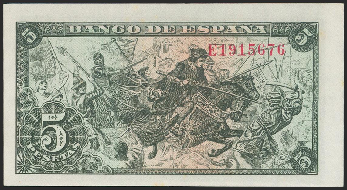 English 5 Pesetas. June 15, 1945. Series E. (Edifil 2021: 449a). Retains much of the original size. Good Extremely Fine.