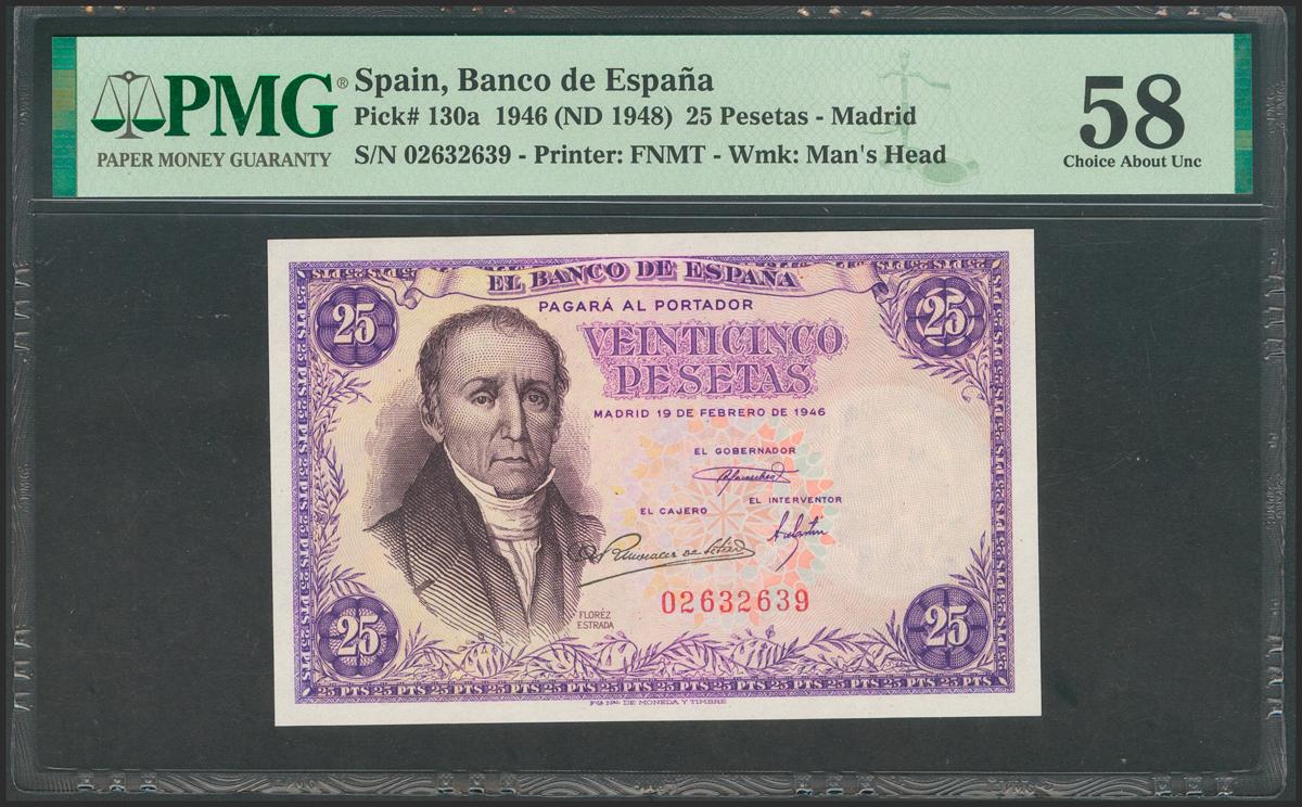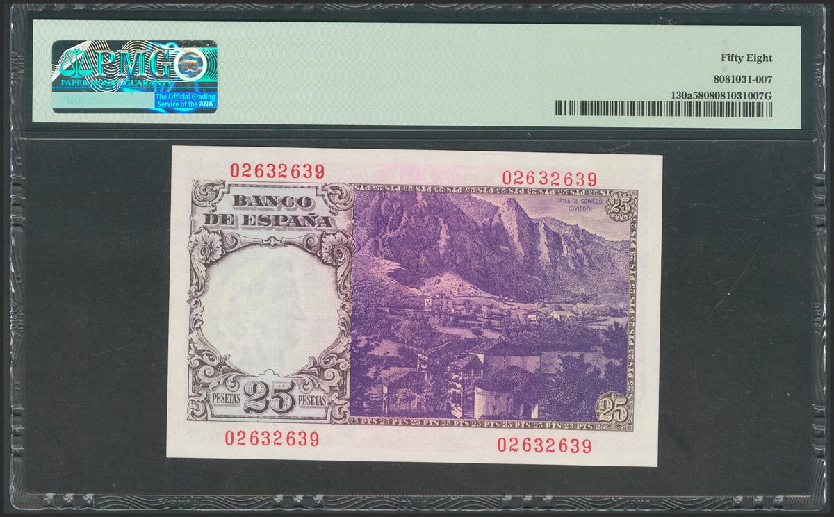 English 25 Pesetas. February 19, 1946. Without series. (Edifil 2021: 450). Unusual Good Extremely Fine. PMG58 package.