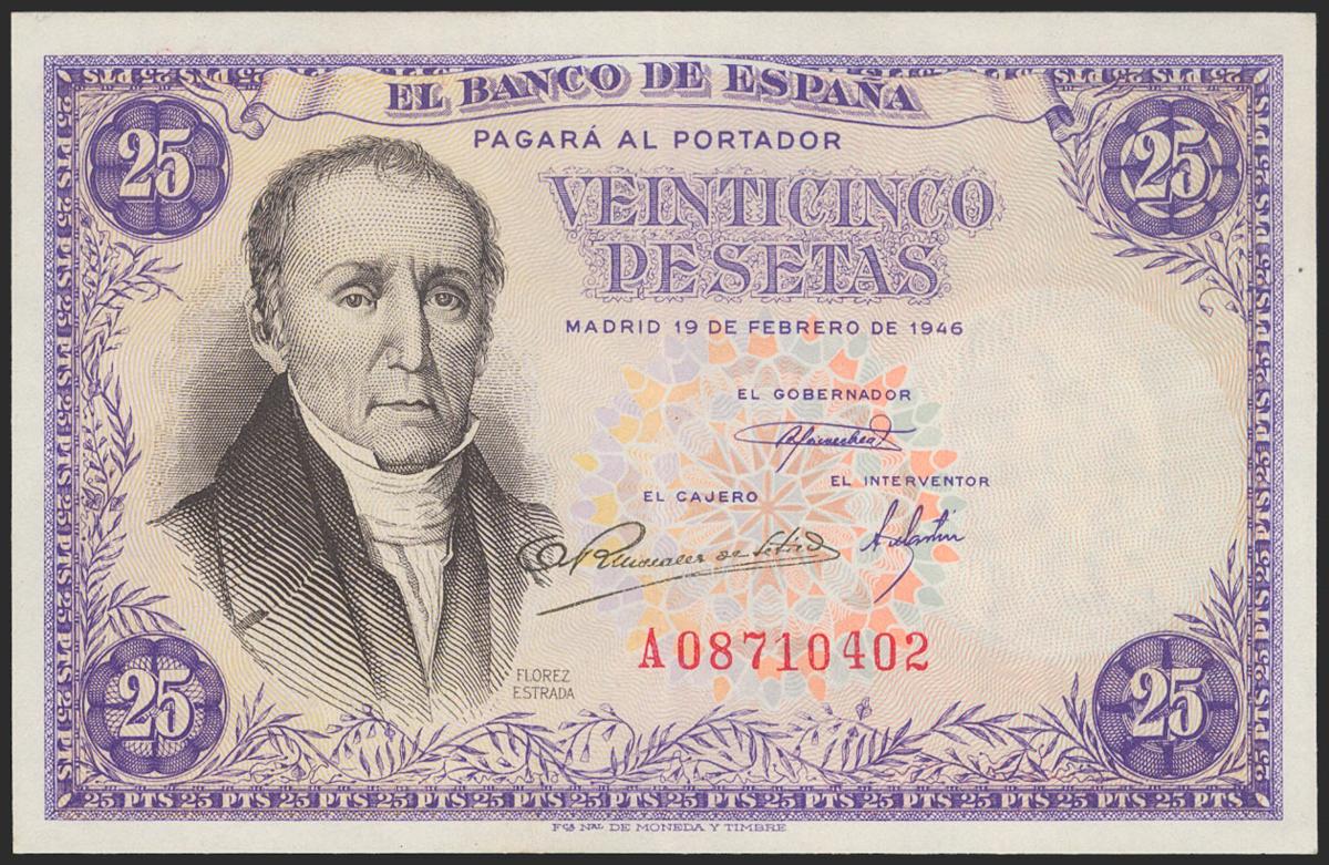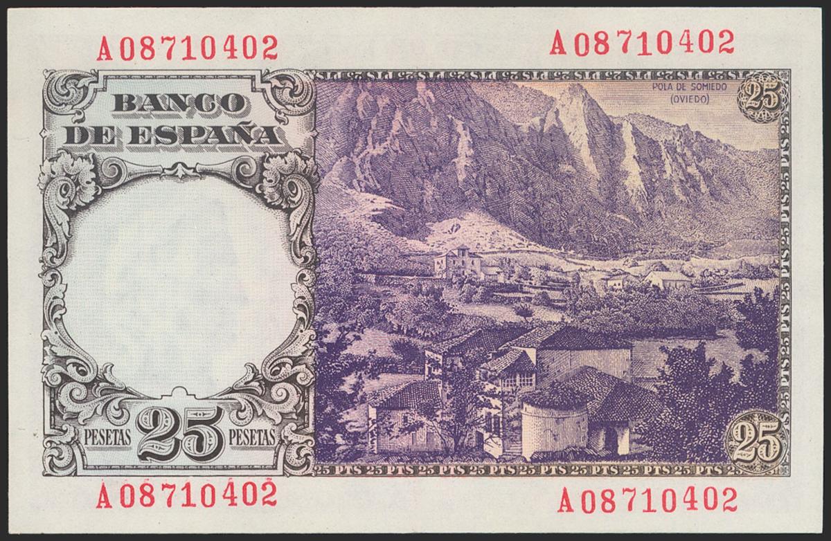 English 25 Pesetas. February 19, 1946. Series A. (Edifil 2021: 450a). It retains part of its original size. Good Extremely Fine.