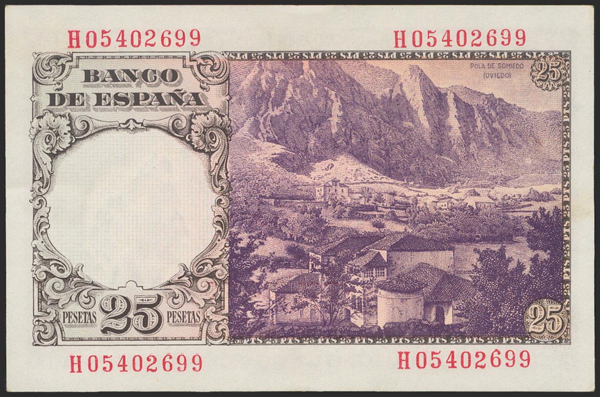 English 25 Pesetas. February 19, 1946. Series H. (Edifil 2021: 450a). Original sizing. Almost Uncirculated.