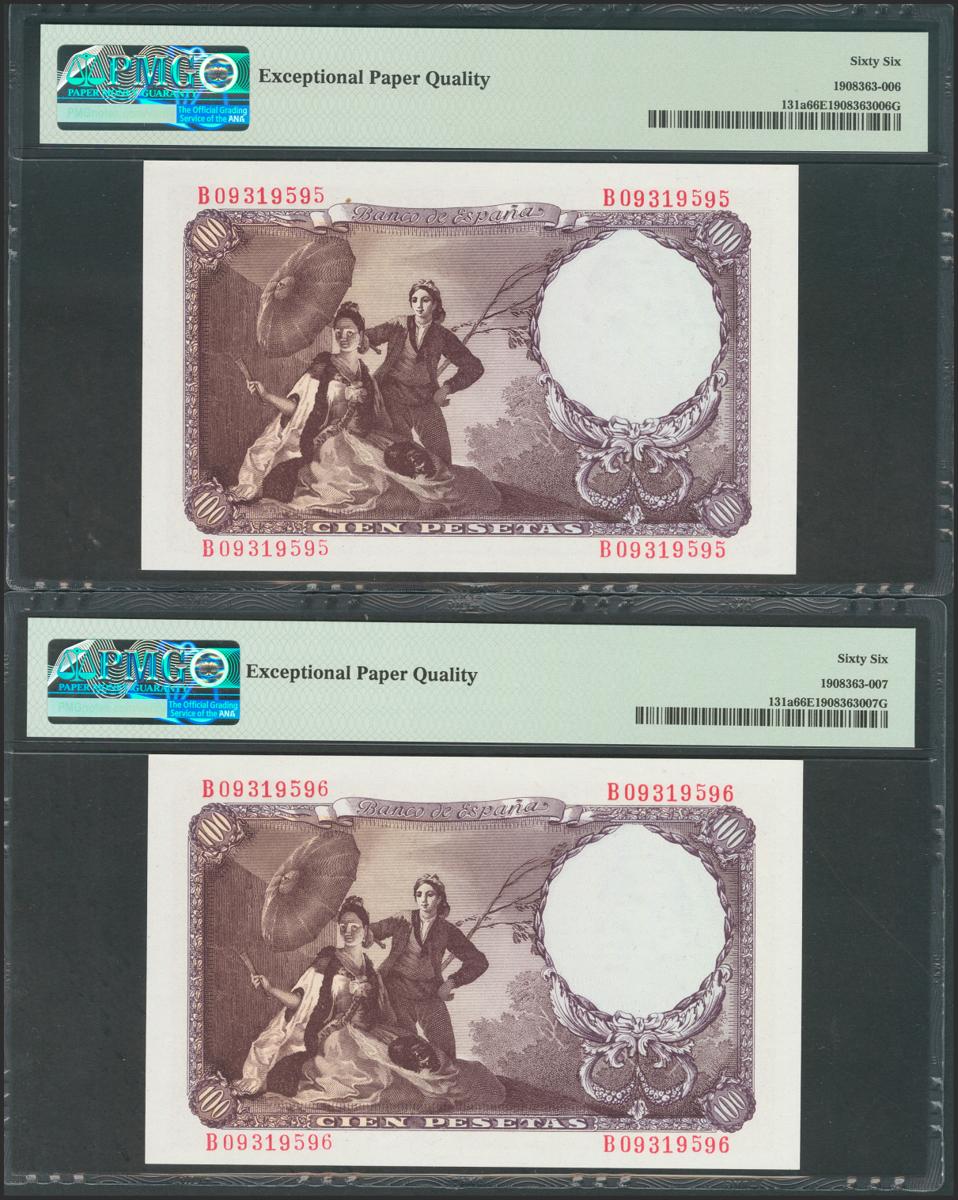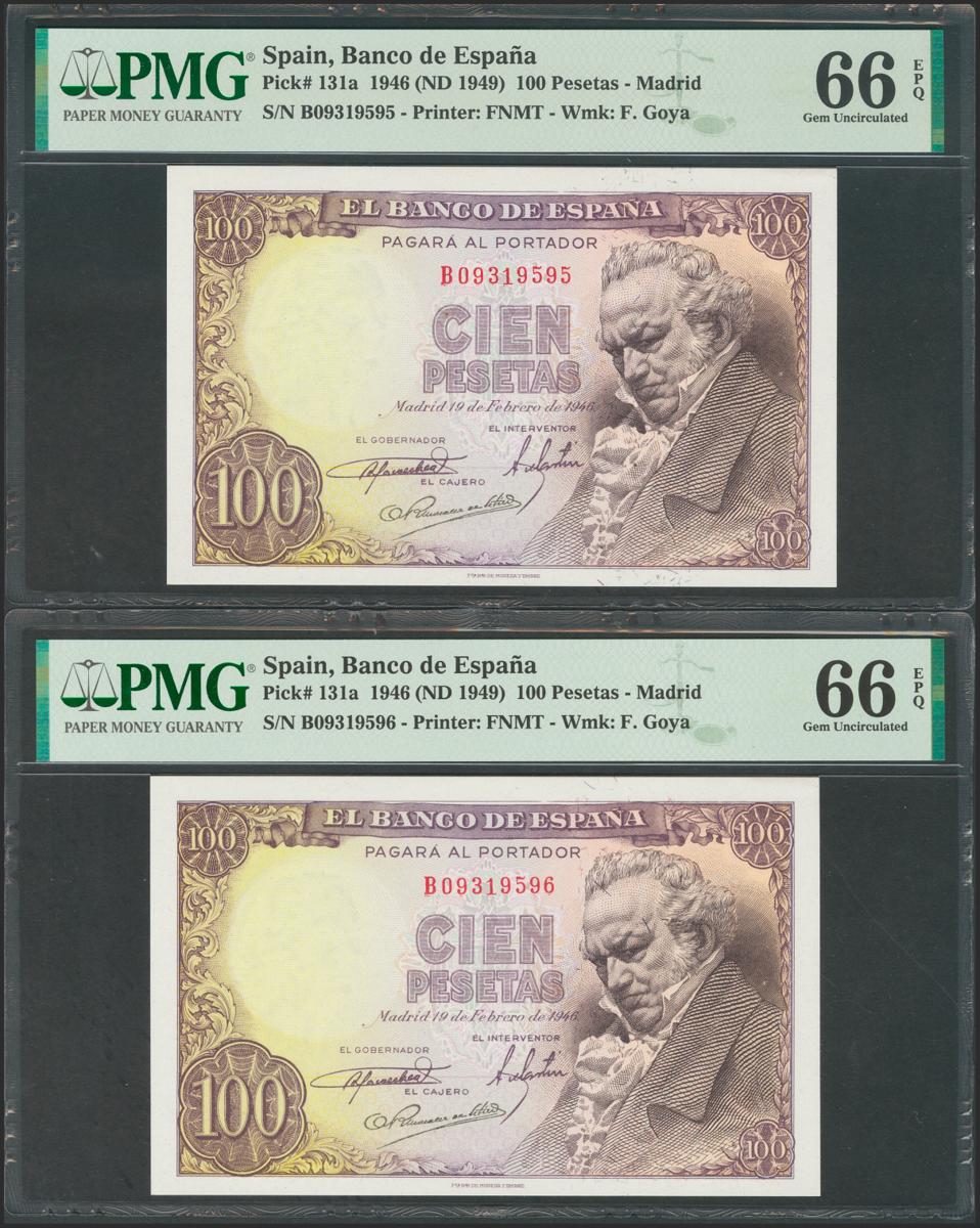 100 pesetas. February 19, 1946. Correlative couple. Series B. (Edifil 2017: 451b). It keeps all its original size. Uncirculated. PMG66EPQ packages, both.