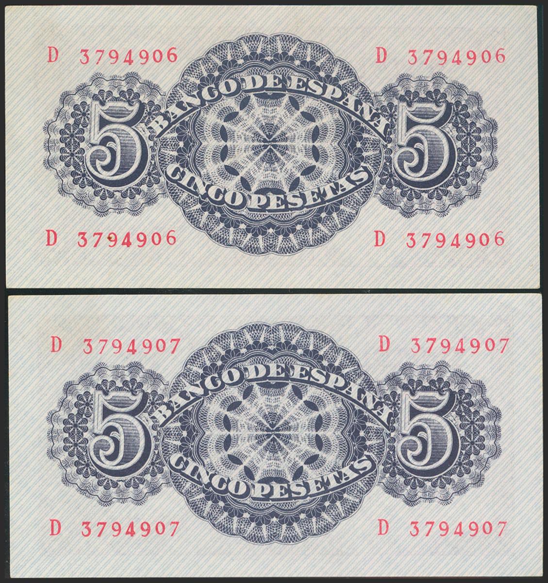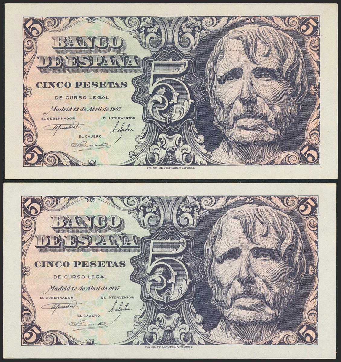 5 Pesetas. April 12, 1947. Correlative pair. Series D. (Edifil 2021: 454a). Original sizing. Uncirculated.