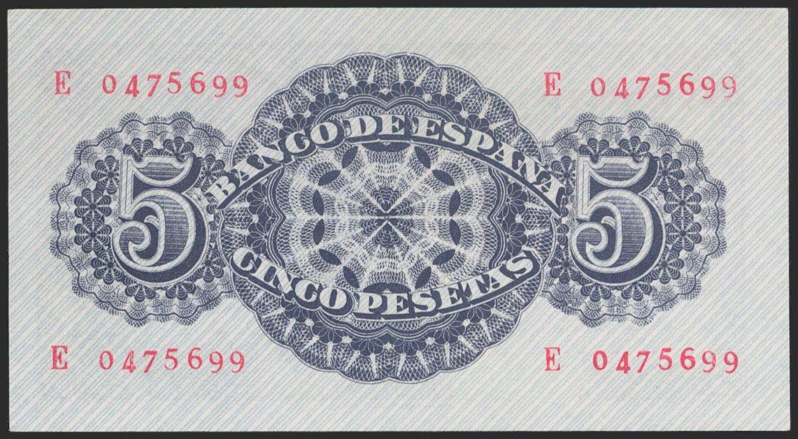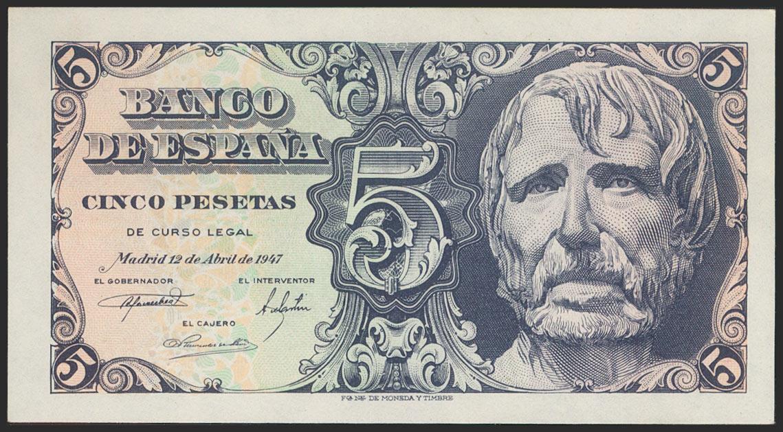 5 Pesetas. April 12, 1947. Series E, last series issued. (Edifil 2021: 454a). Original sizing. Uncirculated.
