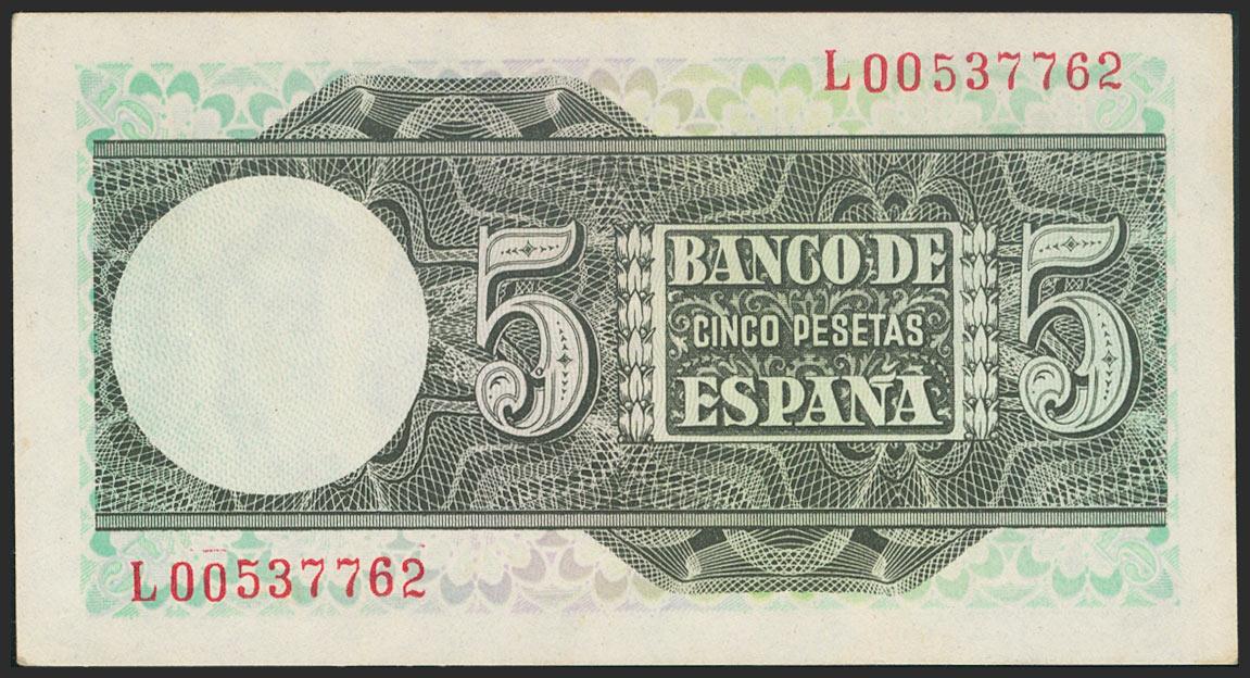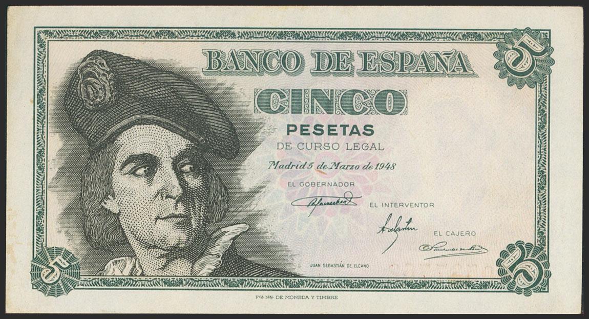 English 5 Pesetas. March 15, 1948. Series L. (Edifil 2021: 455a). Retains much of the original size. Good Extremely Fine.