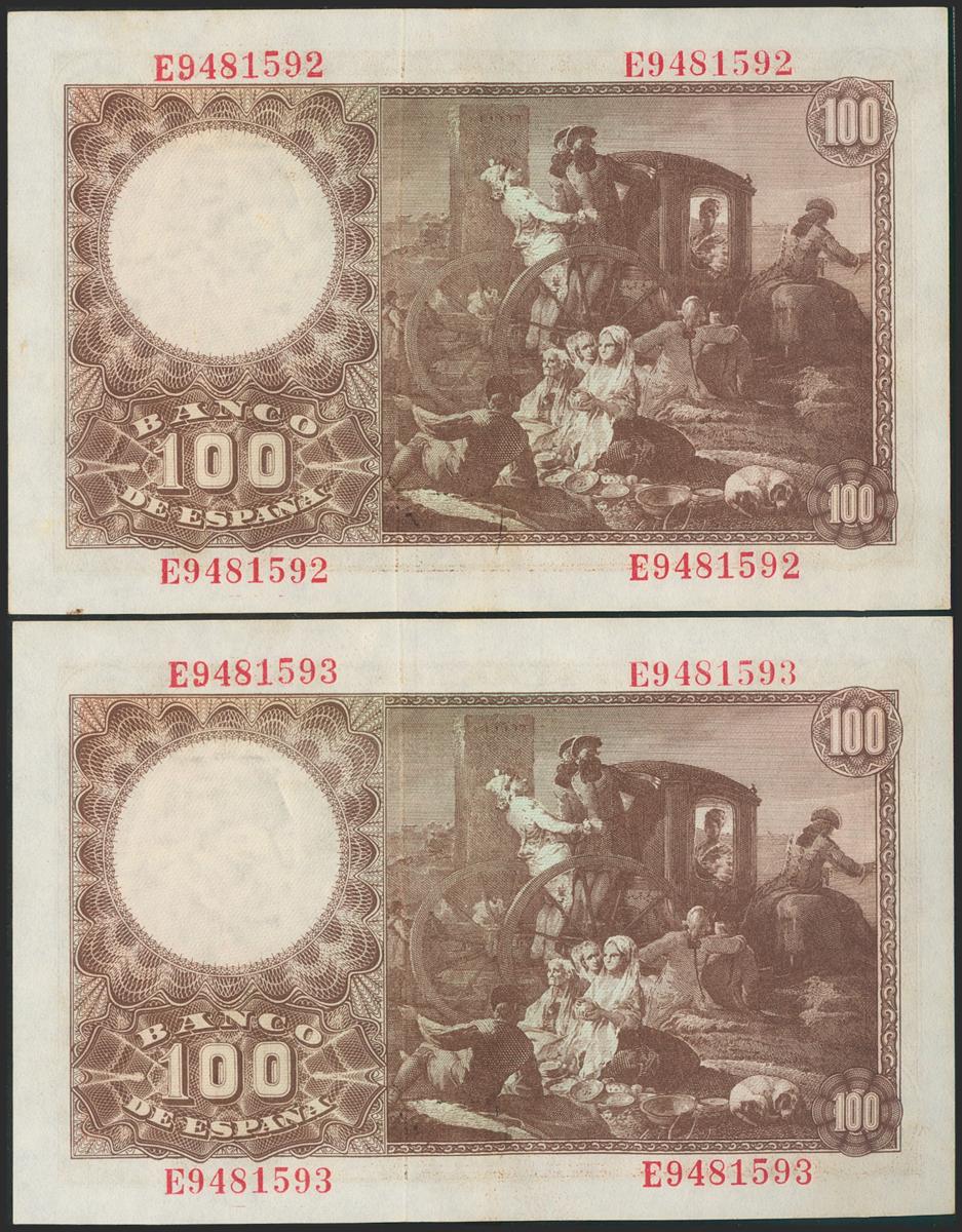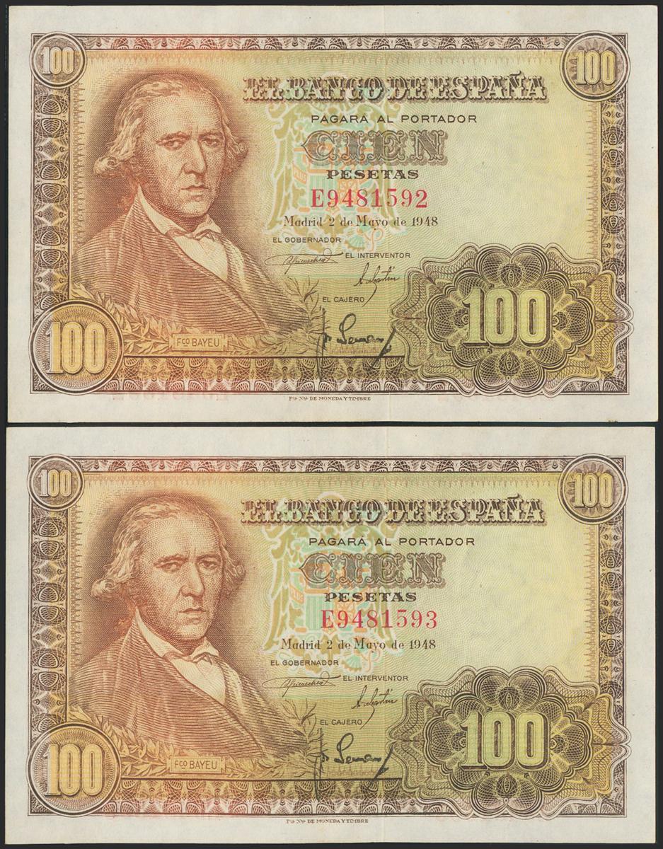 English 100 pesetas. May 2, 1948. Correlative pair. Series E. (Edifil 2021: 456a). It retains part of the original size. Good Extremely Fine.