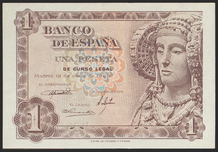 English 1 peseta. June 19, 1948. Series B. (Edifil 2021: 457a). Original sizing. Almost Uncirculated.