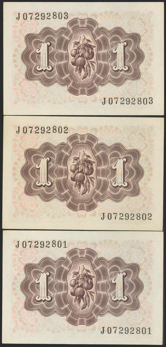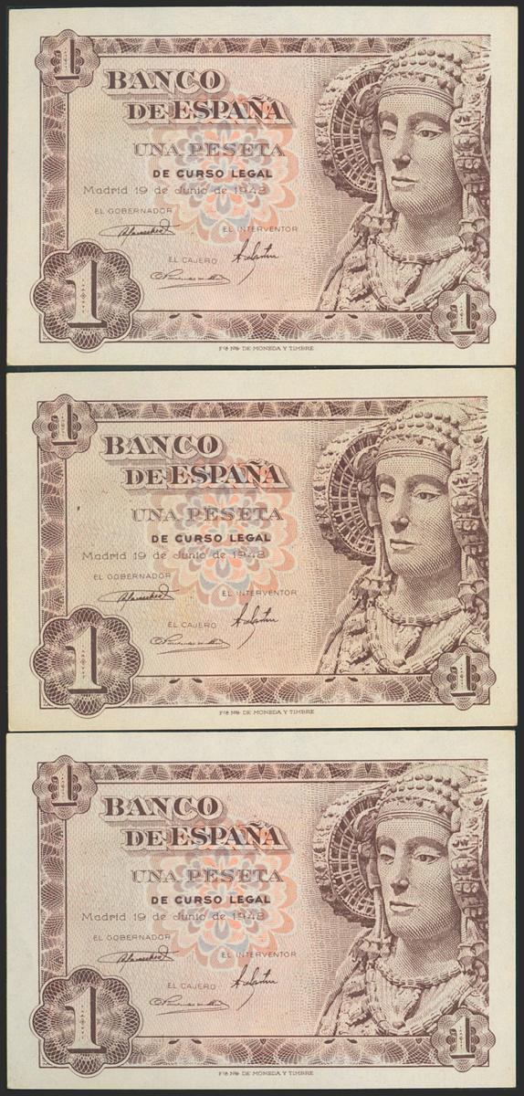 1 peseta. June 19, 1948. Correlative trio. Series J. (Edifil 2021: 457a). Original sizing. Uncirculated.