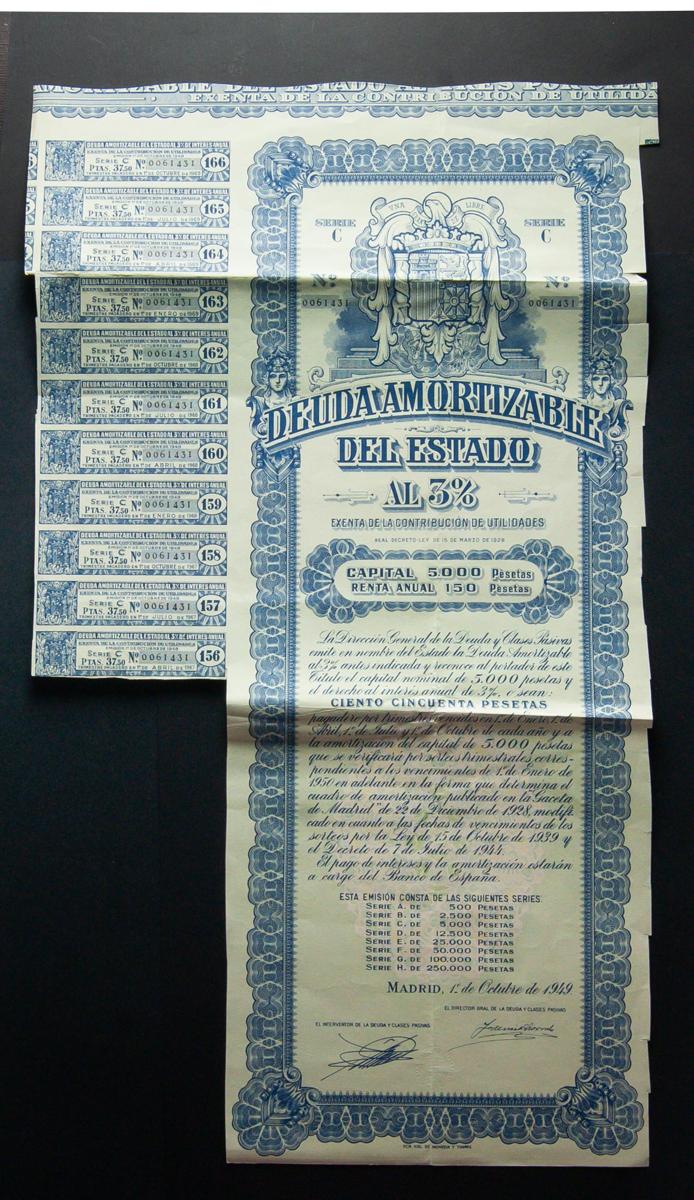 State amortizable debt at 3%. October 1, 1949. Capital of 12,500 pesetas (salmon), with some coupons. Very Fine.