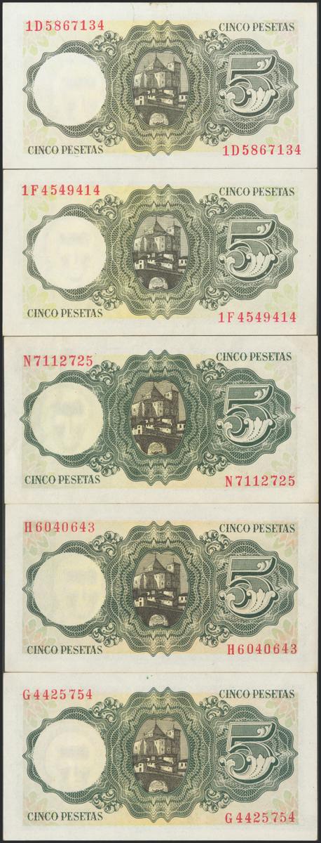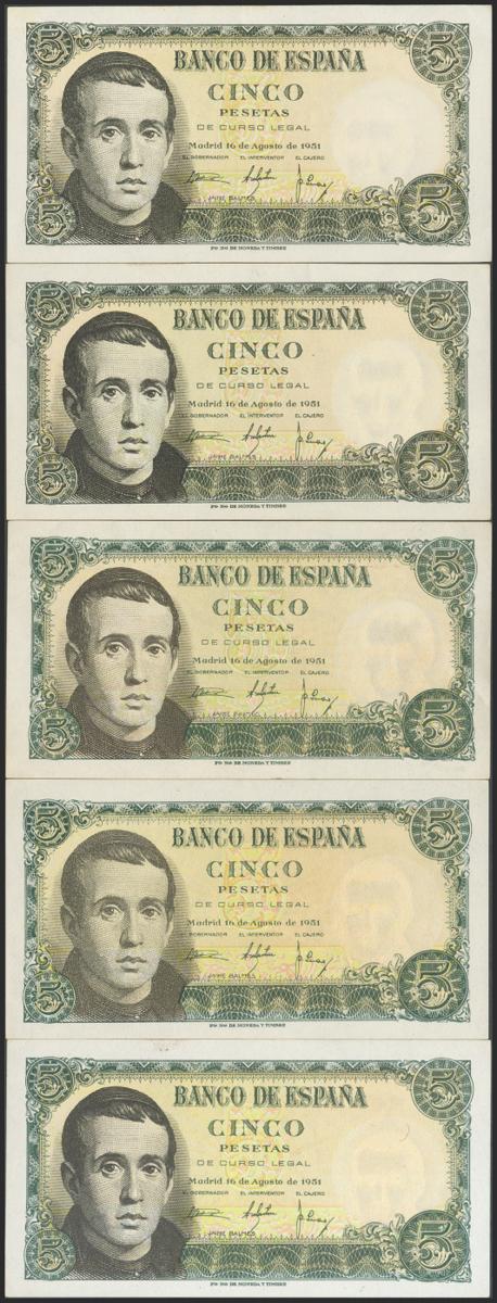 Set of 5 banknotes of 5 Pesetas issued on August 16, 1951, with series G, H, N, 1D and 1F. (Edifil 2021: 459a). Preserving its original size. Uncirculated/ Almost Uncirculated.