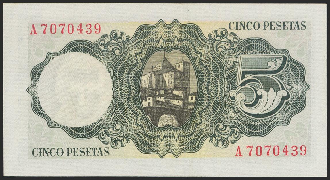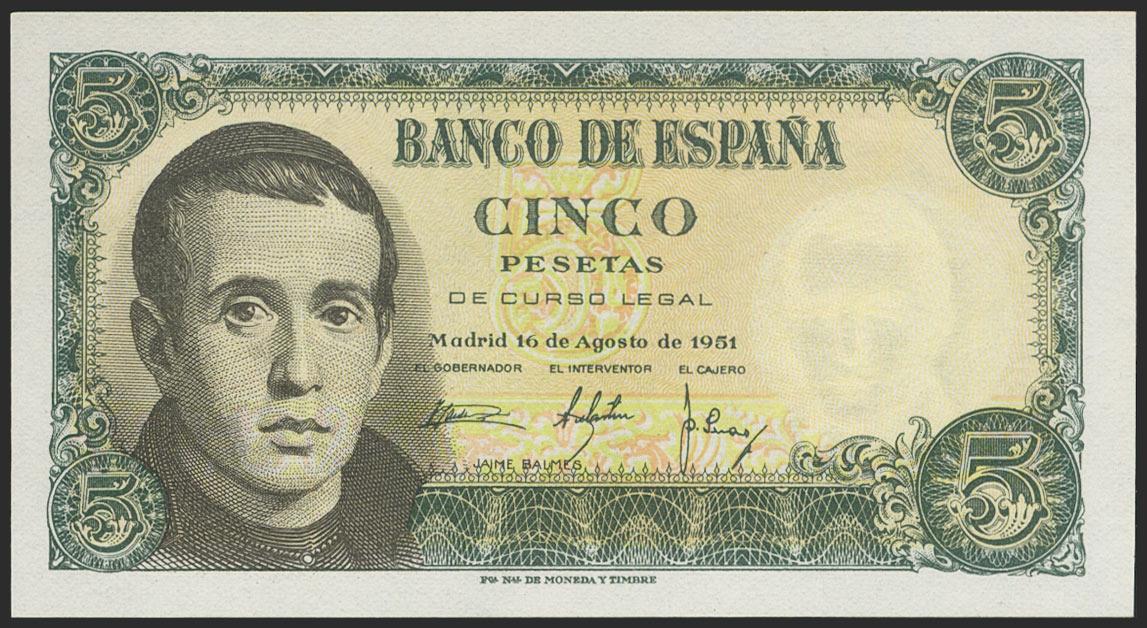 5 Pesetas. August 16, 1951. Series A. (Edifil 2021: 459a). Retains much of the original size. Good Extremely Fine.