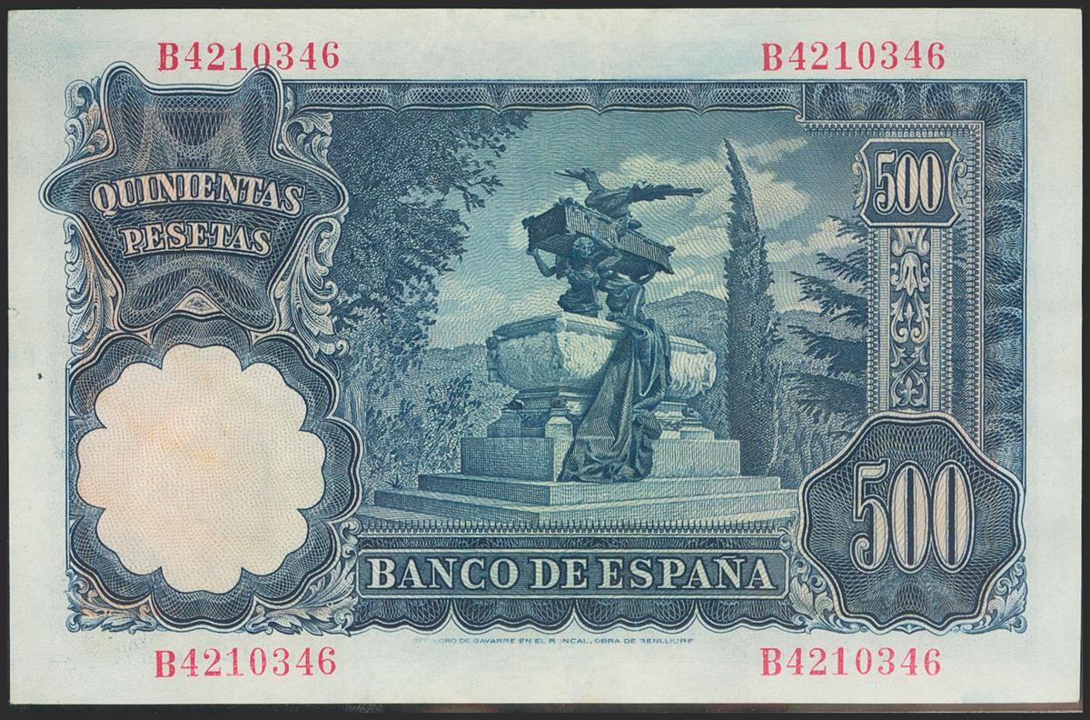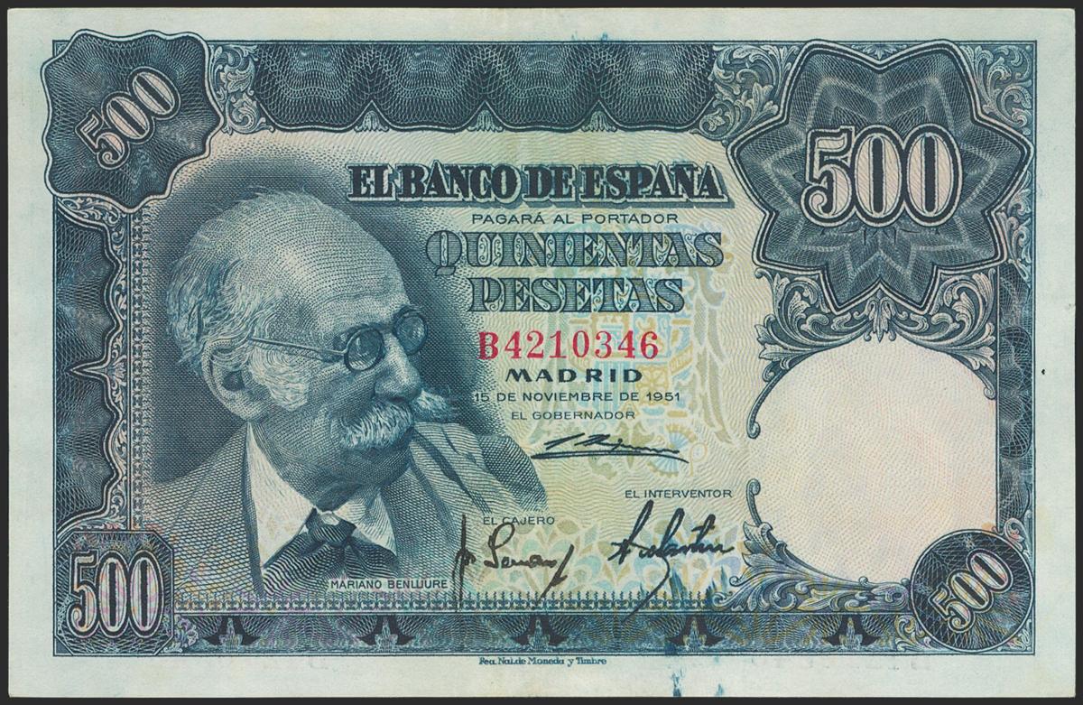 500 pesetas. November 15, 1951. Series B. (Edifil 2021: 460a). It retains some of its original size. Almost Extremely Fine.