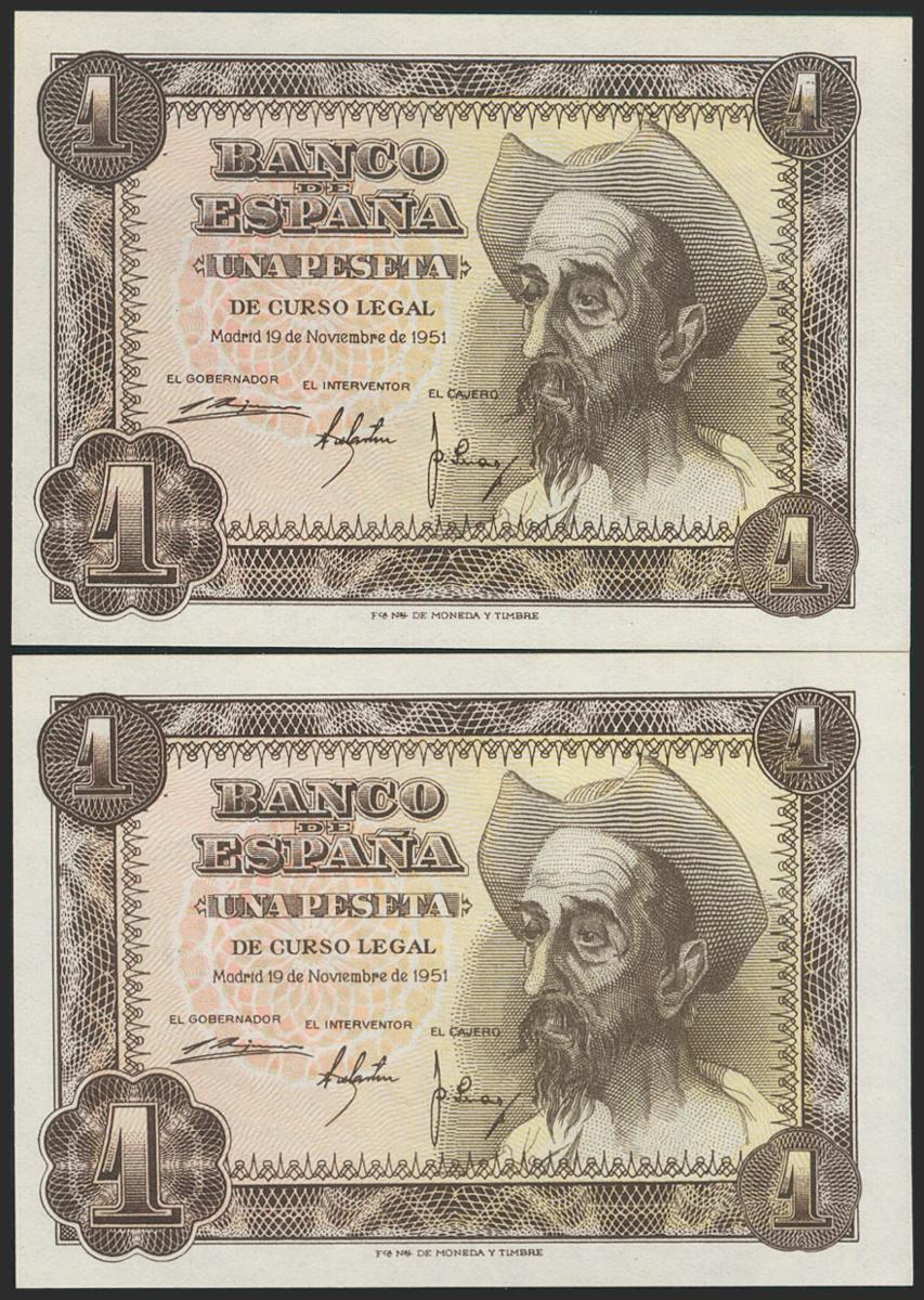 1 peseta. November 19, 1951. Correlative couple. Series E. (Edifil 2021: 461a). Original sizing. Uncirculated.