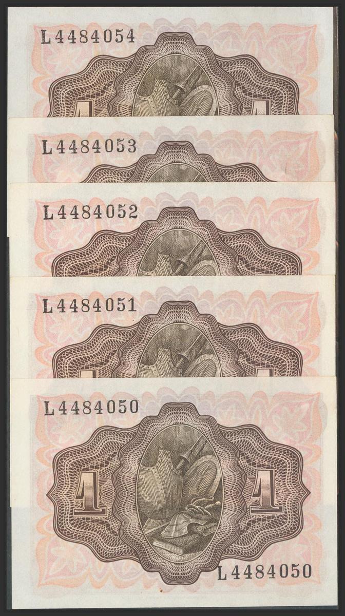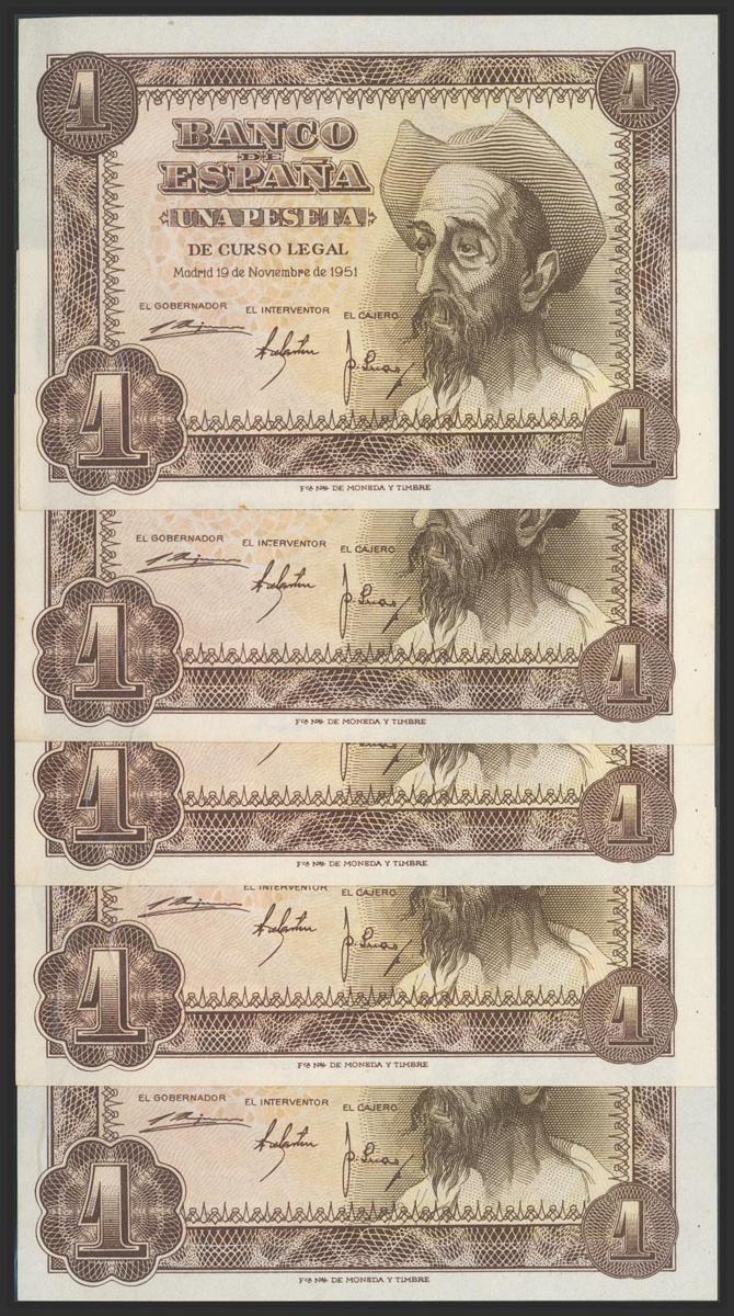 English Set of 5 correlative 1 Peseta banknotes issued on November 19, 1951, with the L series (Edifil 2017: 461a), original size. Uncirculated/ Almost Uncirculated.