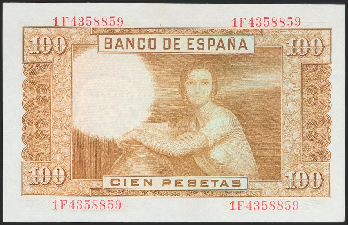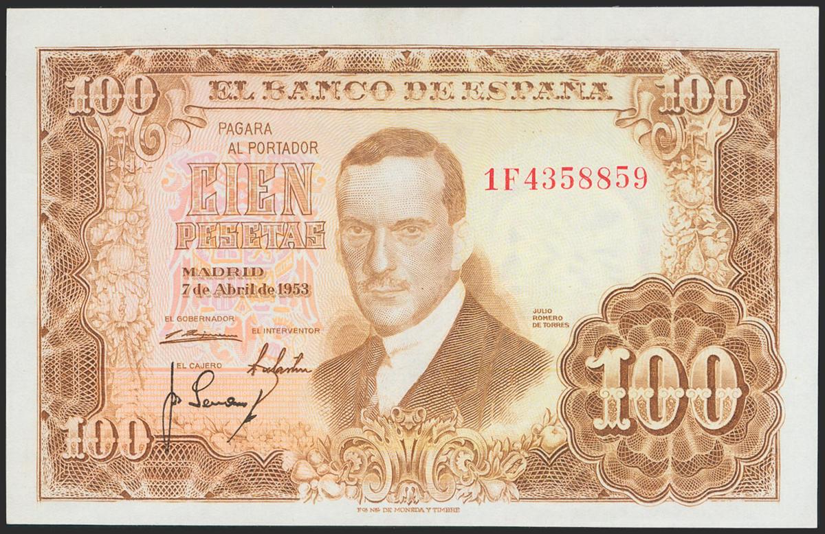 100 pesetas. April 7, 1953. Series 1F. (Edifil 2021: 464c). Original sizing. Uncirculated.