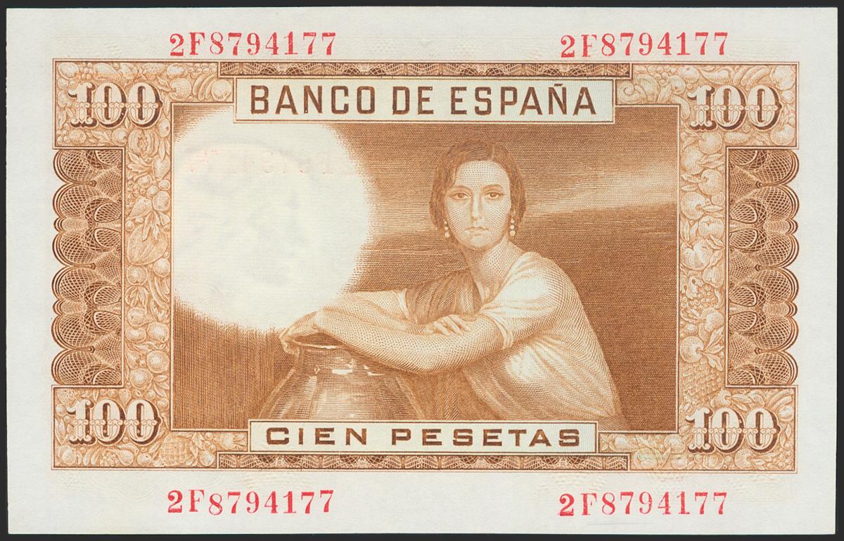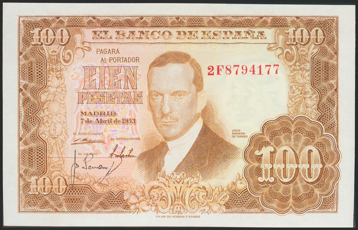 100 pesetas. April 7, 1953. Series 2F. (Edifil 2021: 464c). Original sizing. Uncirculated.