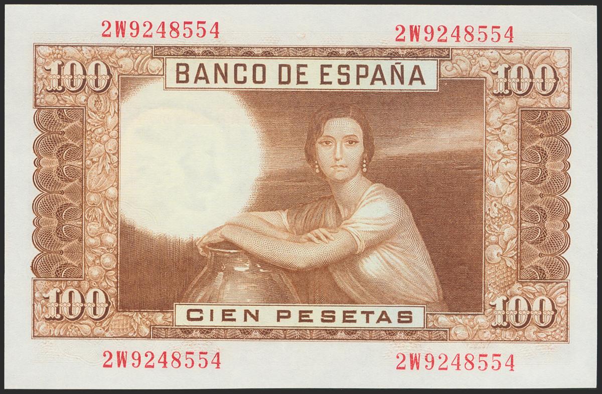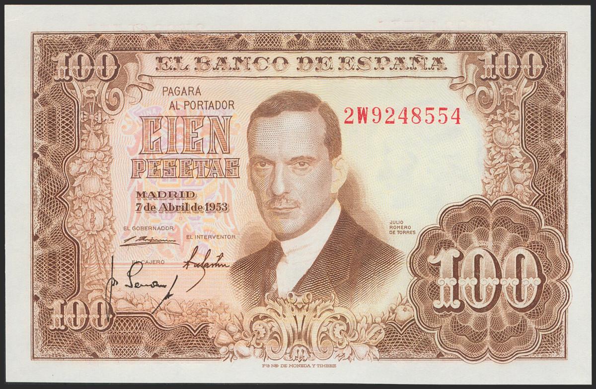 100 pesetas. April 7, 1953. Series 2W. (Edifil 2021: 464c). Original sizing. Almost Uncirculated.