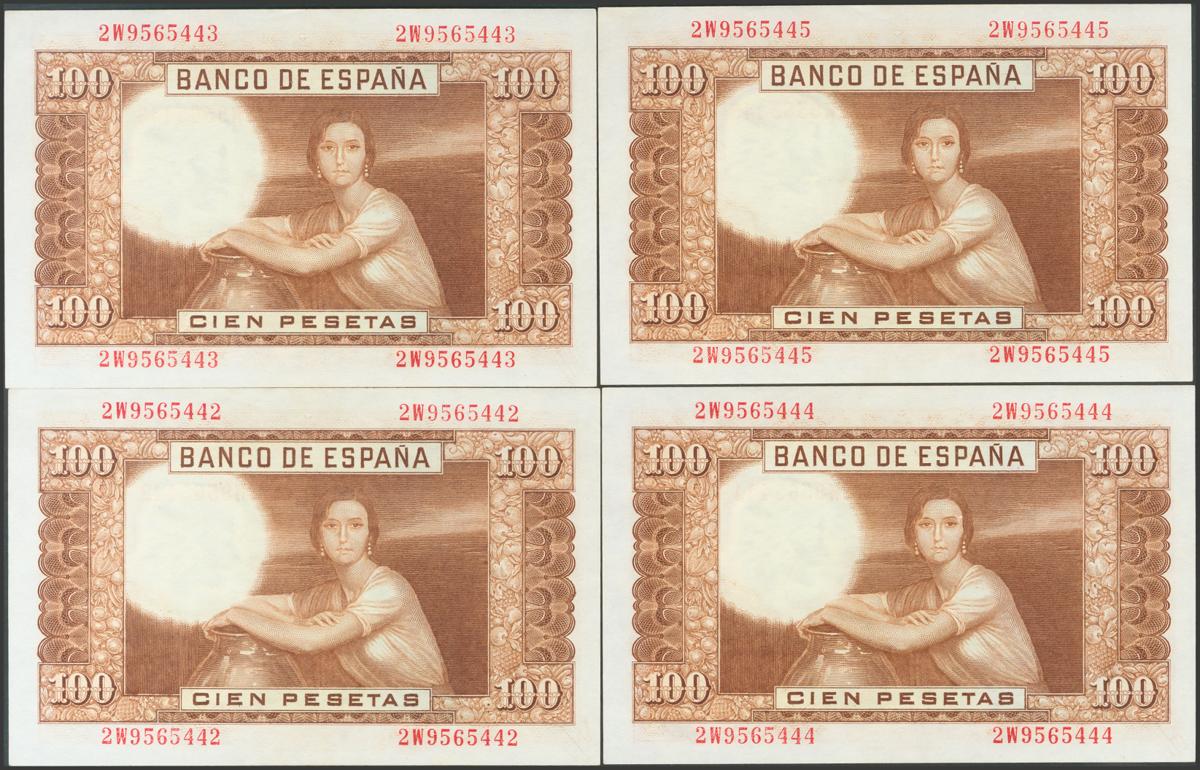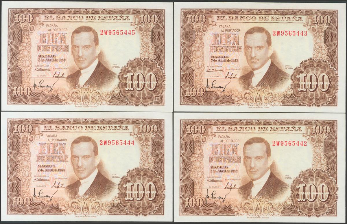 English Set of 4 correlative banknotes of 100 Pesetas issued on April 7, 1953, with the series 2W (Edifil 2017: 464c), all of them with their original size. Uncirculated.