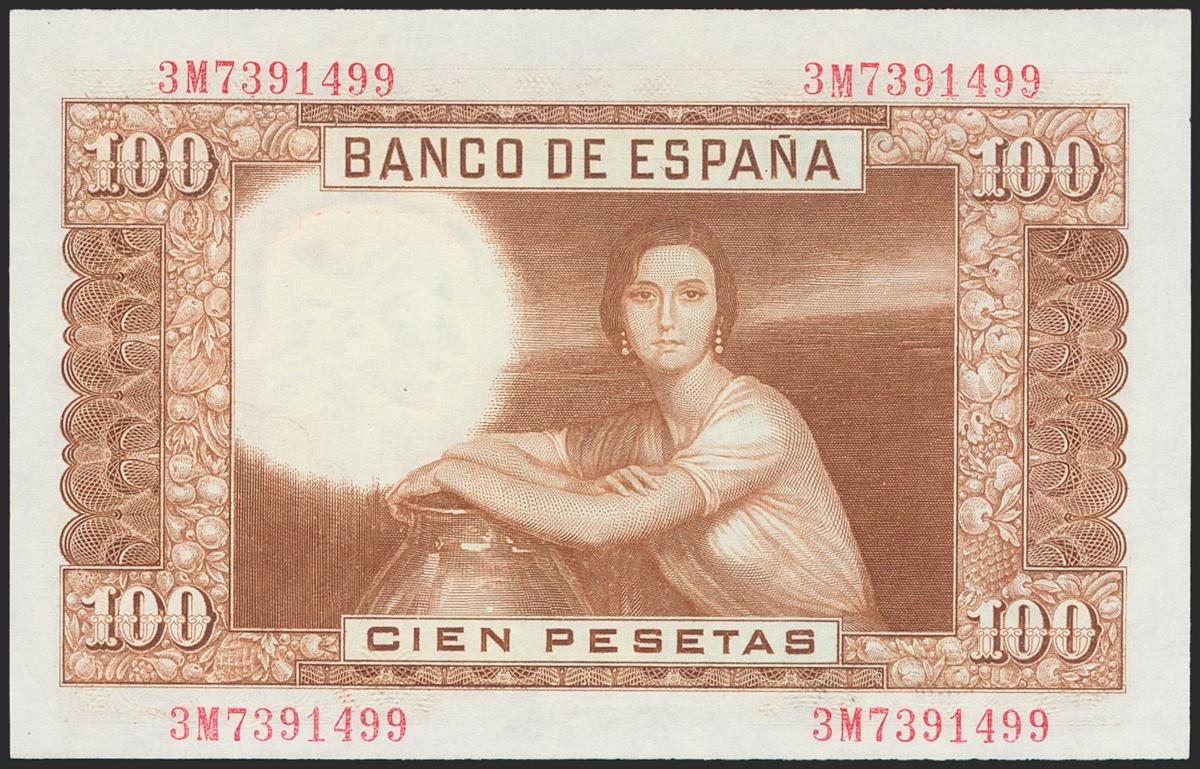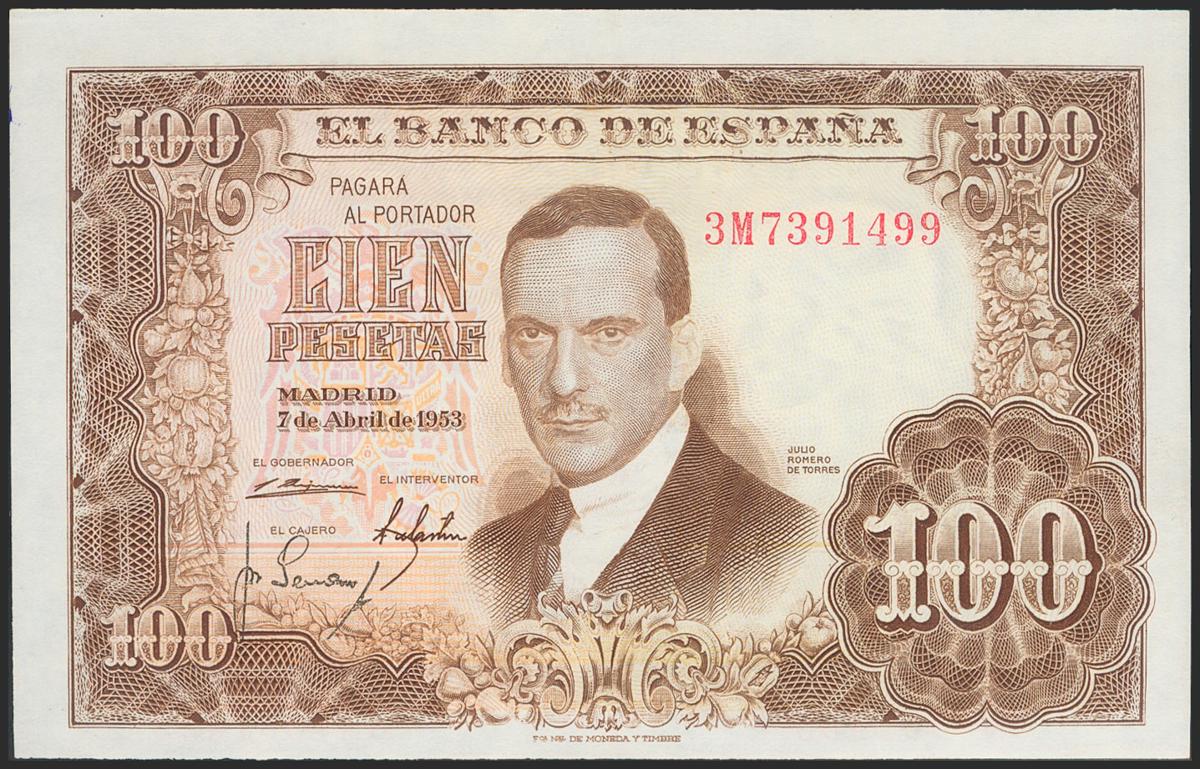 100 pesetas. April 7, 1953. 3M Series. (Edifil 2021: 464c). Original sizing. Almost Uncirculated.