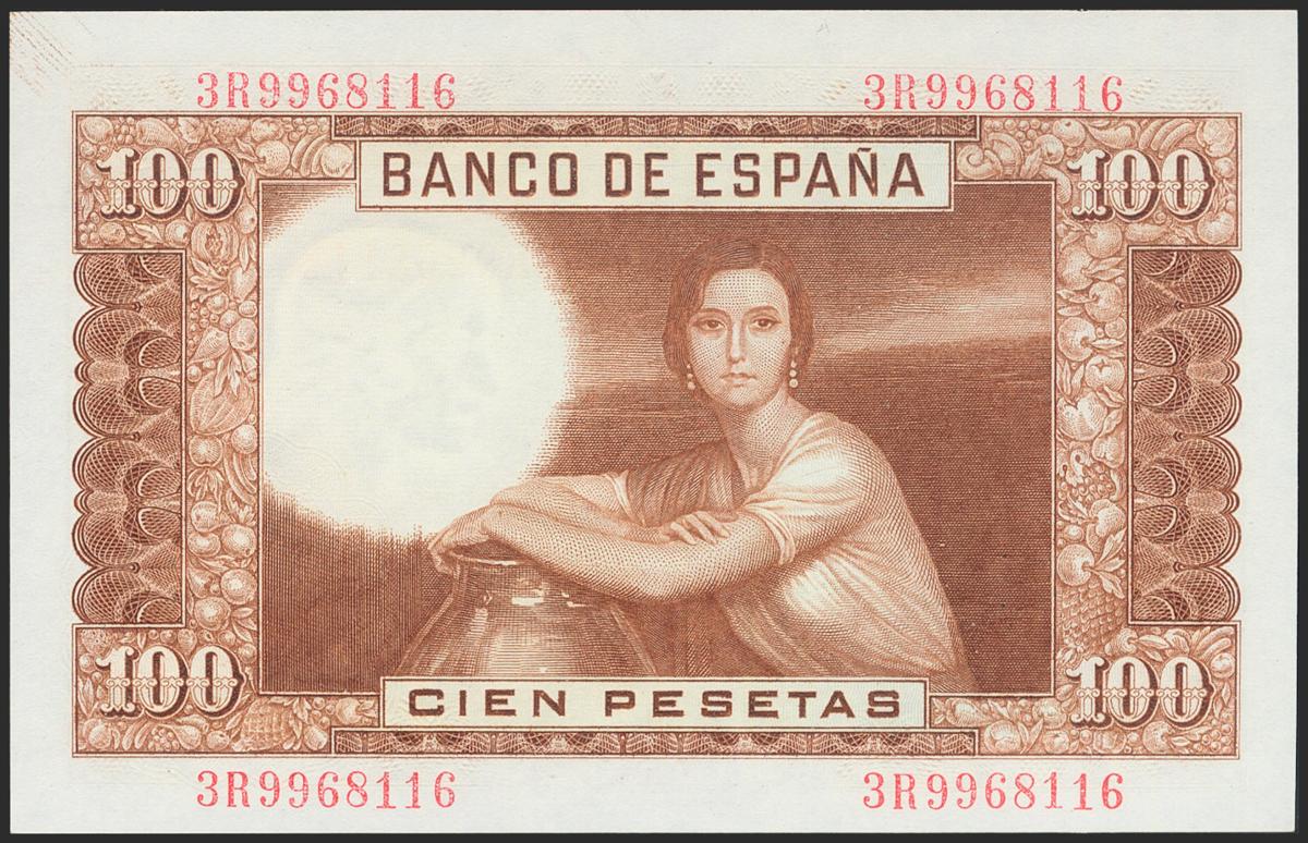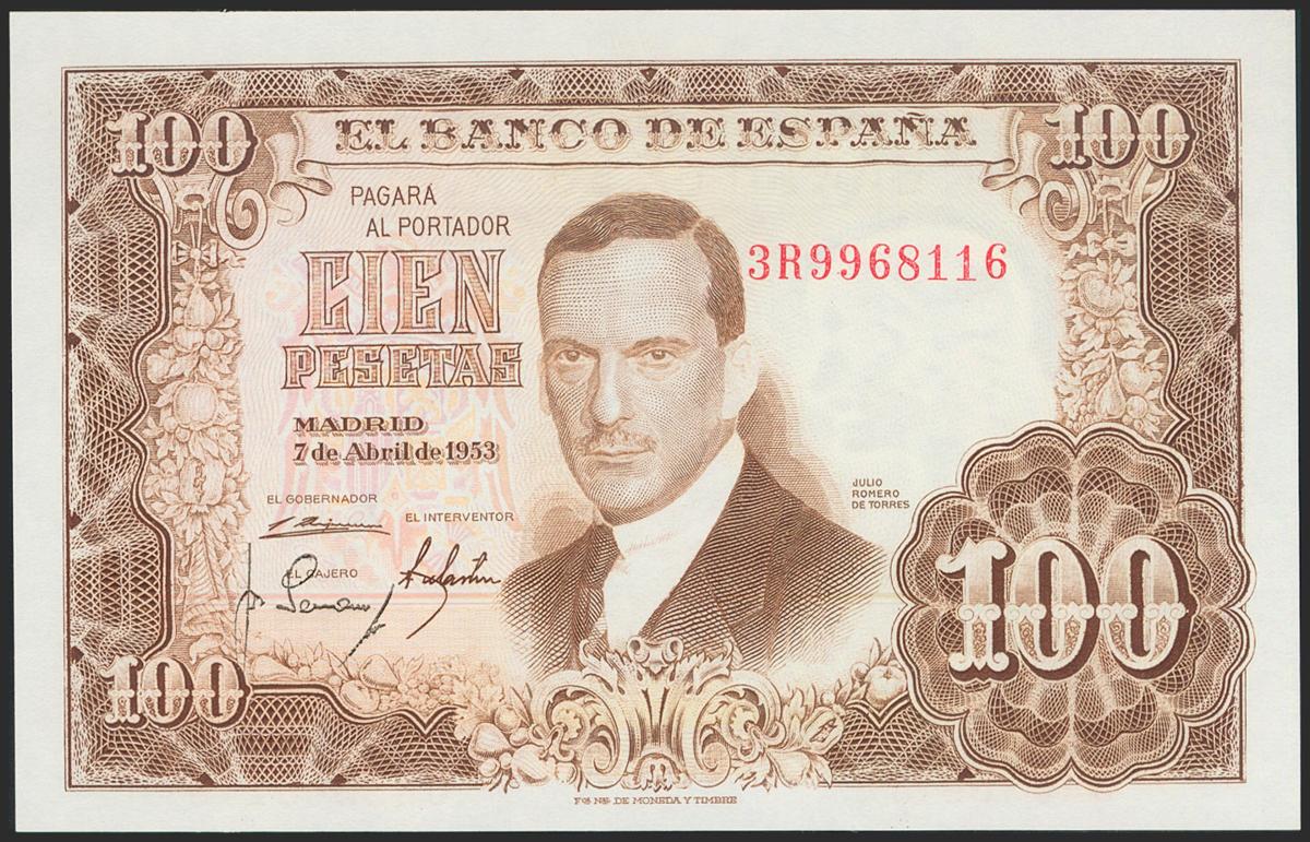 100 pesetas. April 7, 1953. Series 3R. (Edifil 2021: 464c). Original sizing. Uncirculated.