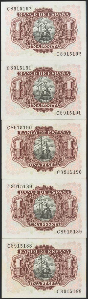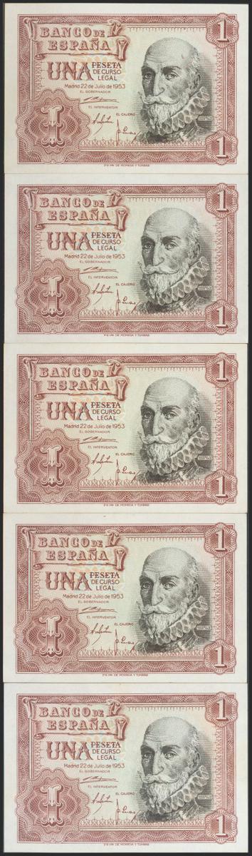 Set of 5 correlative banknotes of 1 Peseta issued on July 22, 1953 and with the series C. (Edifil 2021: 465a), preserving the original size. Uncirculated.