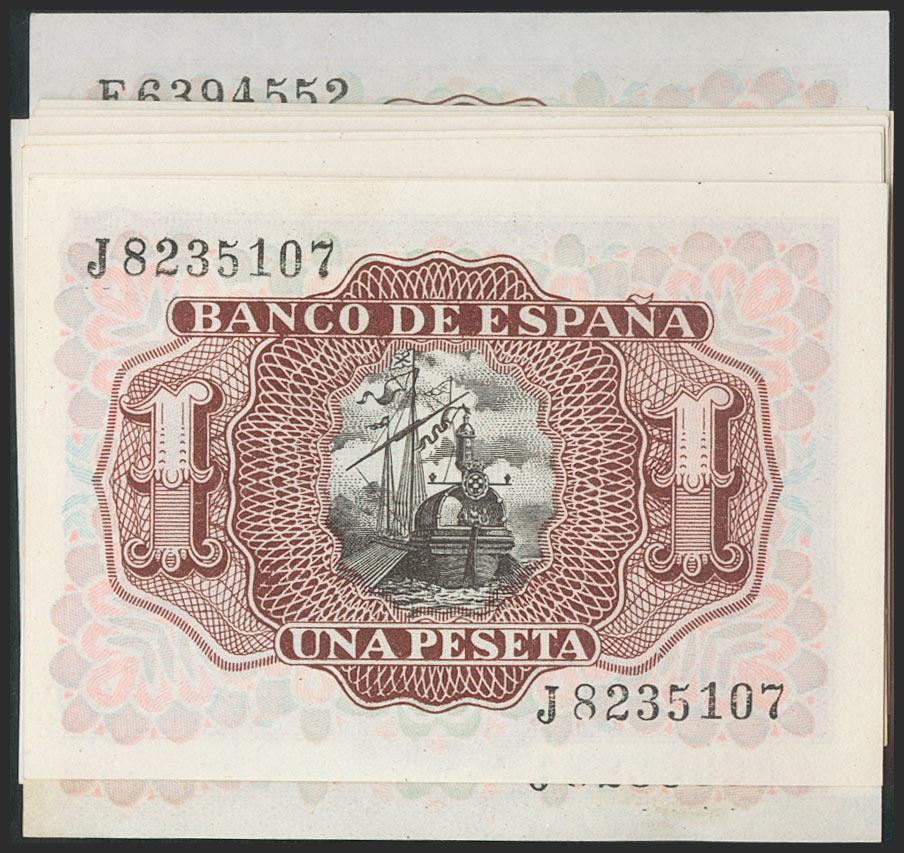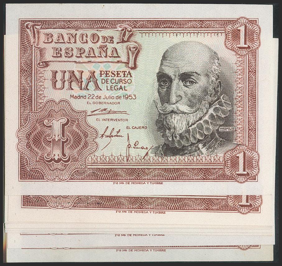 Set of 12 banknotes (some correlatives) of 1 Peseta issued on July 22, 1953, and with series E and J. (Edifil 2021: 465a). Uncirculated/ Almost Uncirculated.