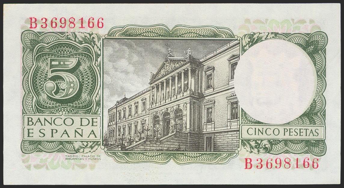 5 Pesetas. July 22, 1954. Series B. (Edifil 2021: 466a). Original sizing. Almost Uncirculated.