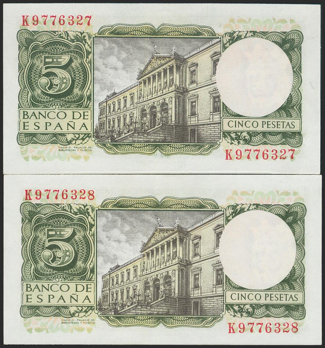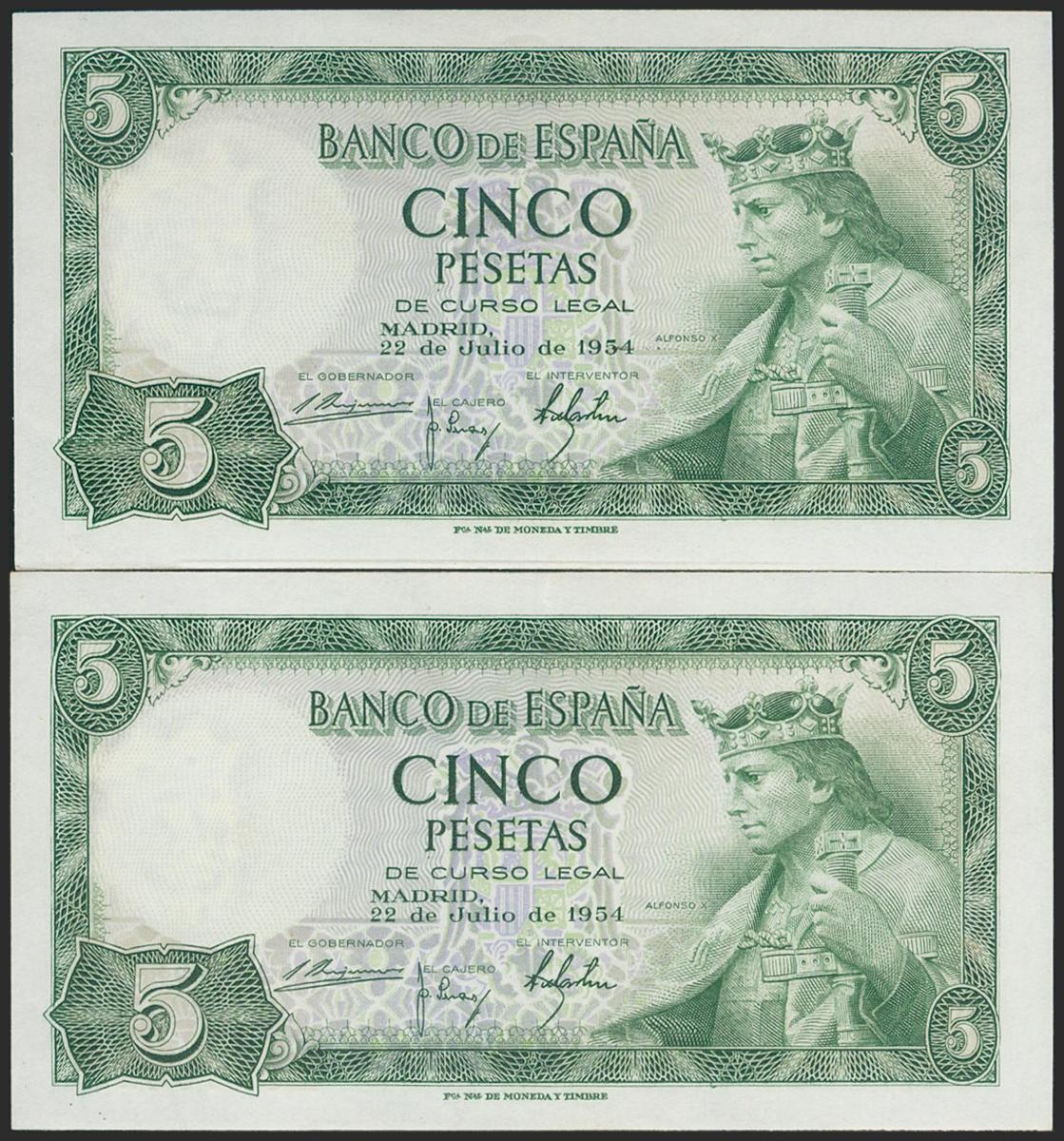 English 5 Pesetas. July 22, 1954. Correlative couple. Series K. (Edifil 2021: 466a). Original sizing. Almost Uncirculated.