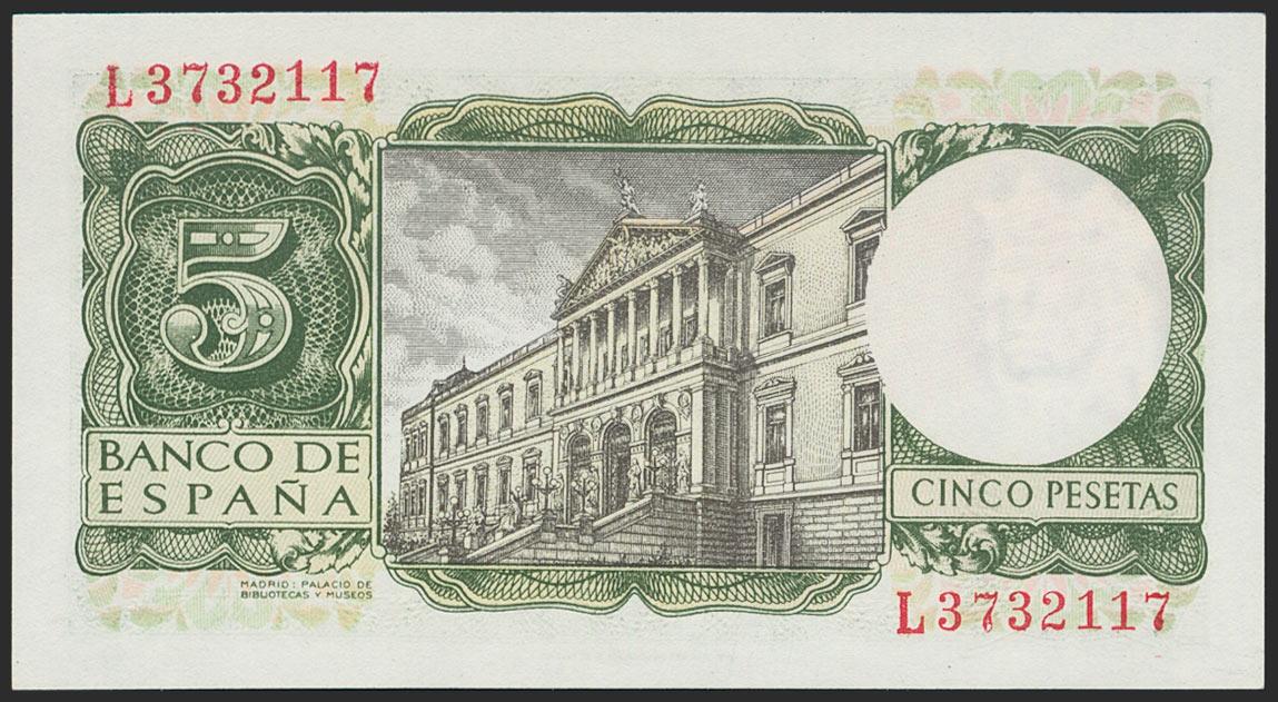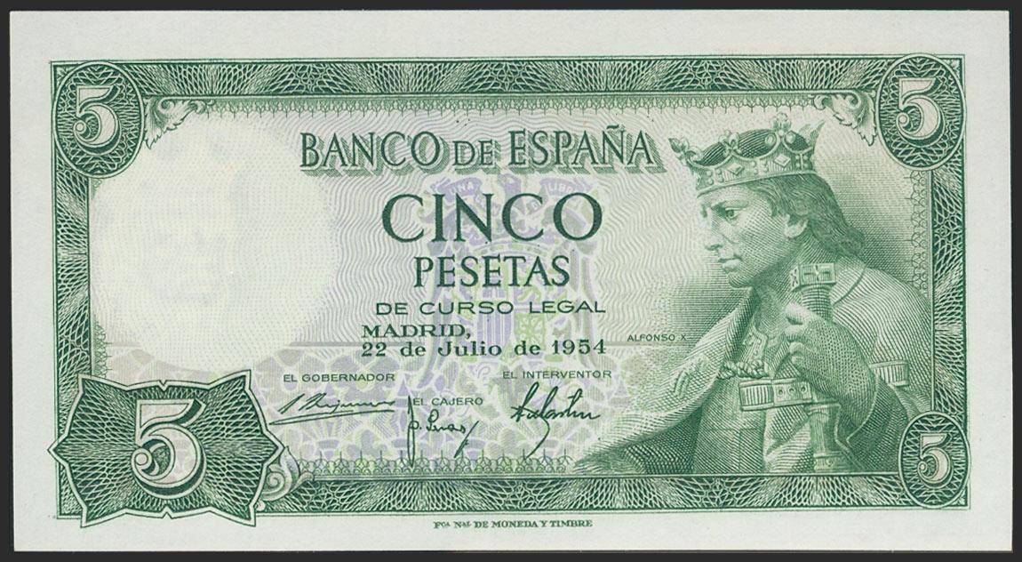 English 5 Pesetas. July 22, 1954. Series L. (Edifil 2021: 466a). Original sizing. Uncirculated.