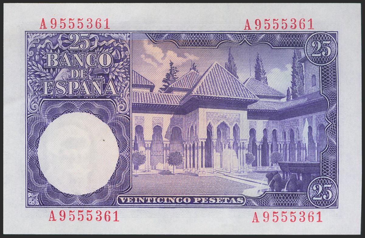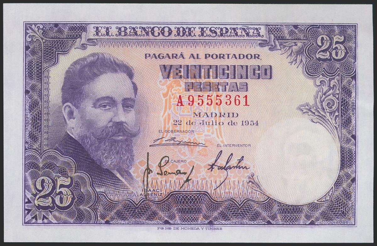 25 Pesetas. July 22, 1954. Series A. (Edifil 2021: 467a). Retains much of the original size. Good Extremely Fine.