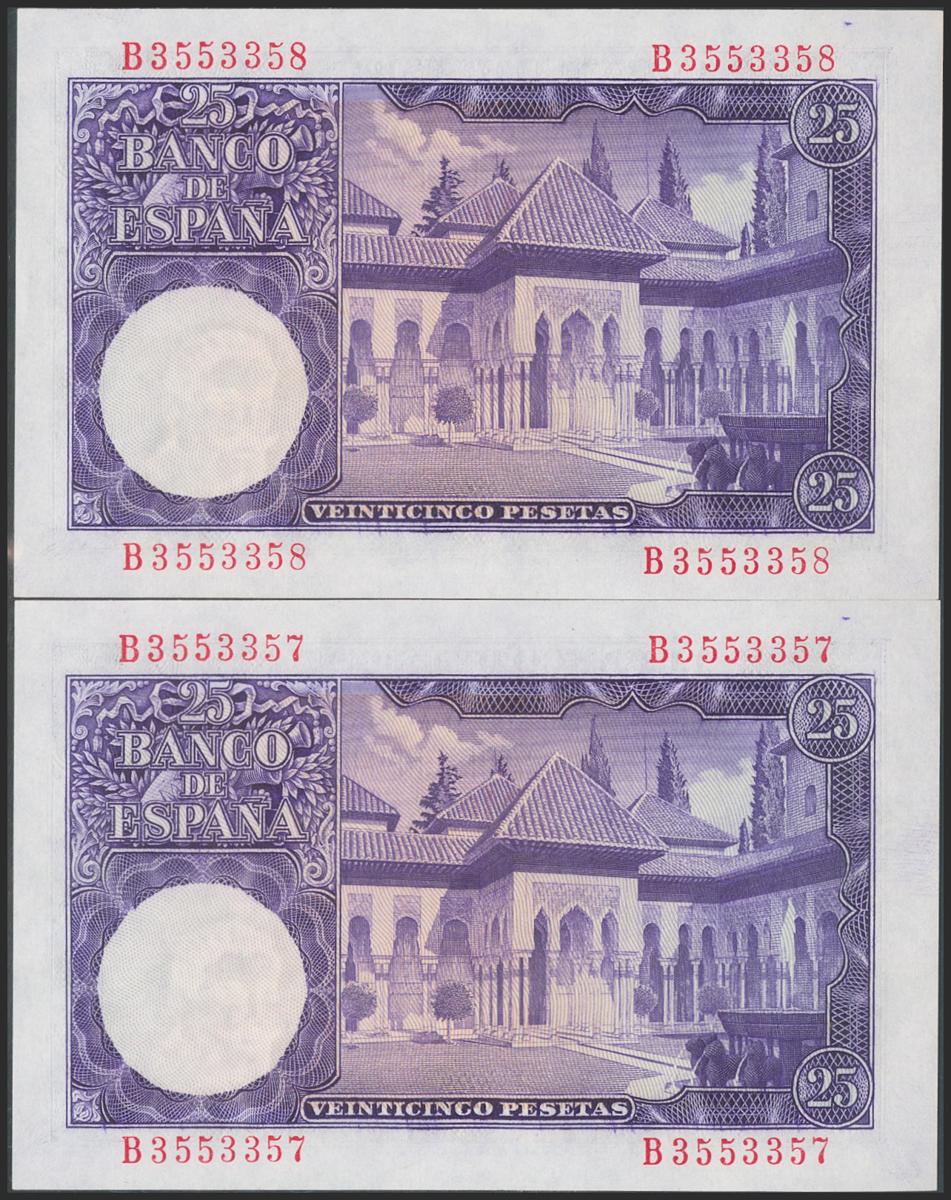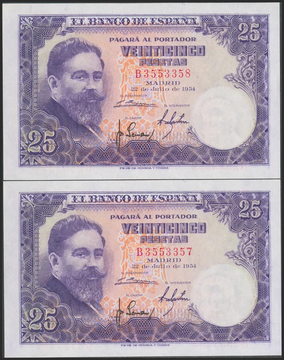 25 Pesetas. July 22, 1954. Correlative couple. Series B. (Edifil 2017: 467a). Uncirculated.