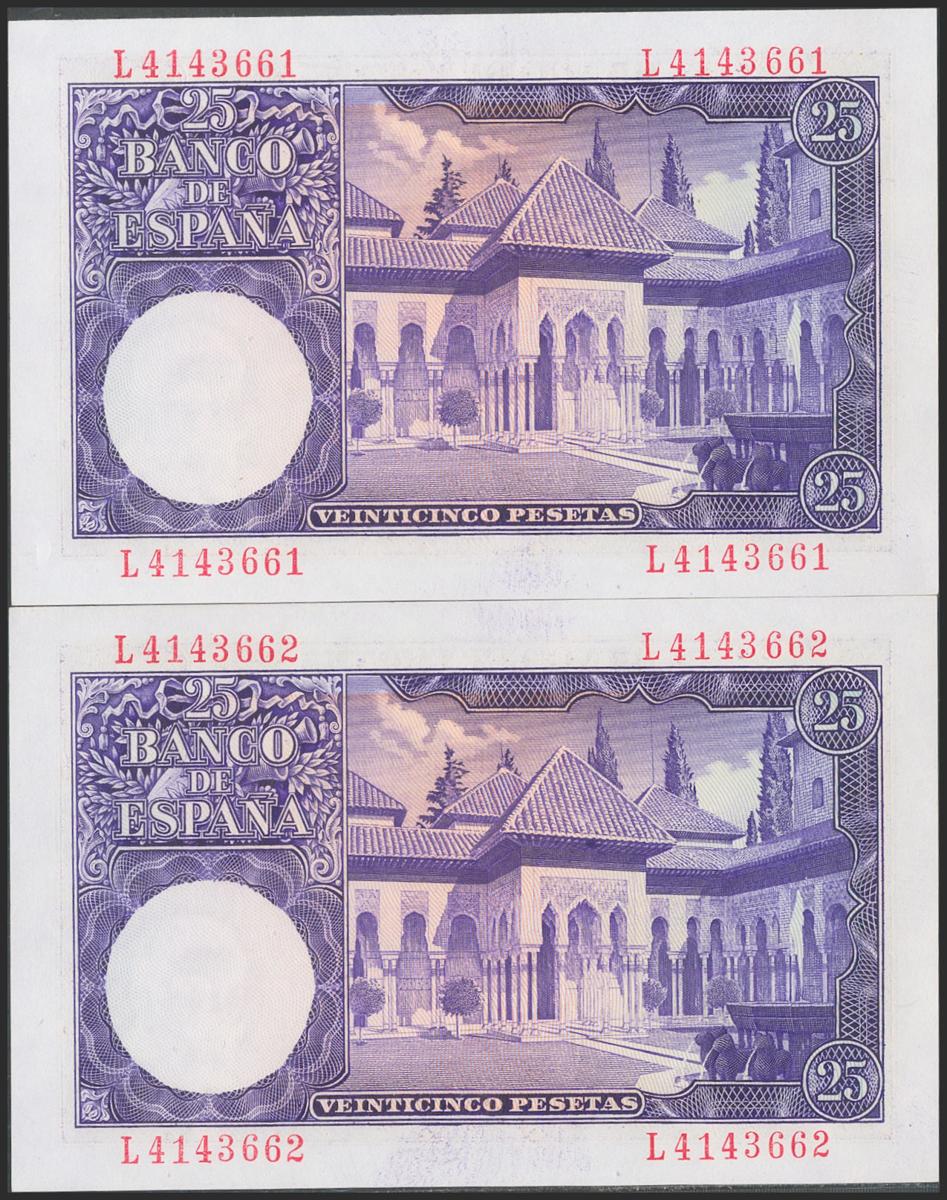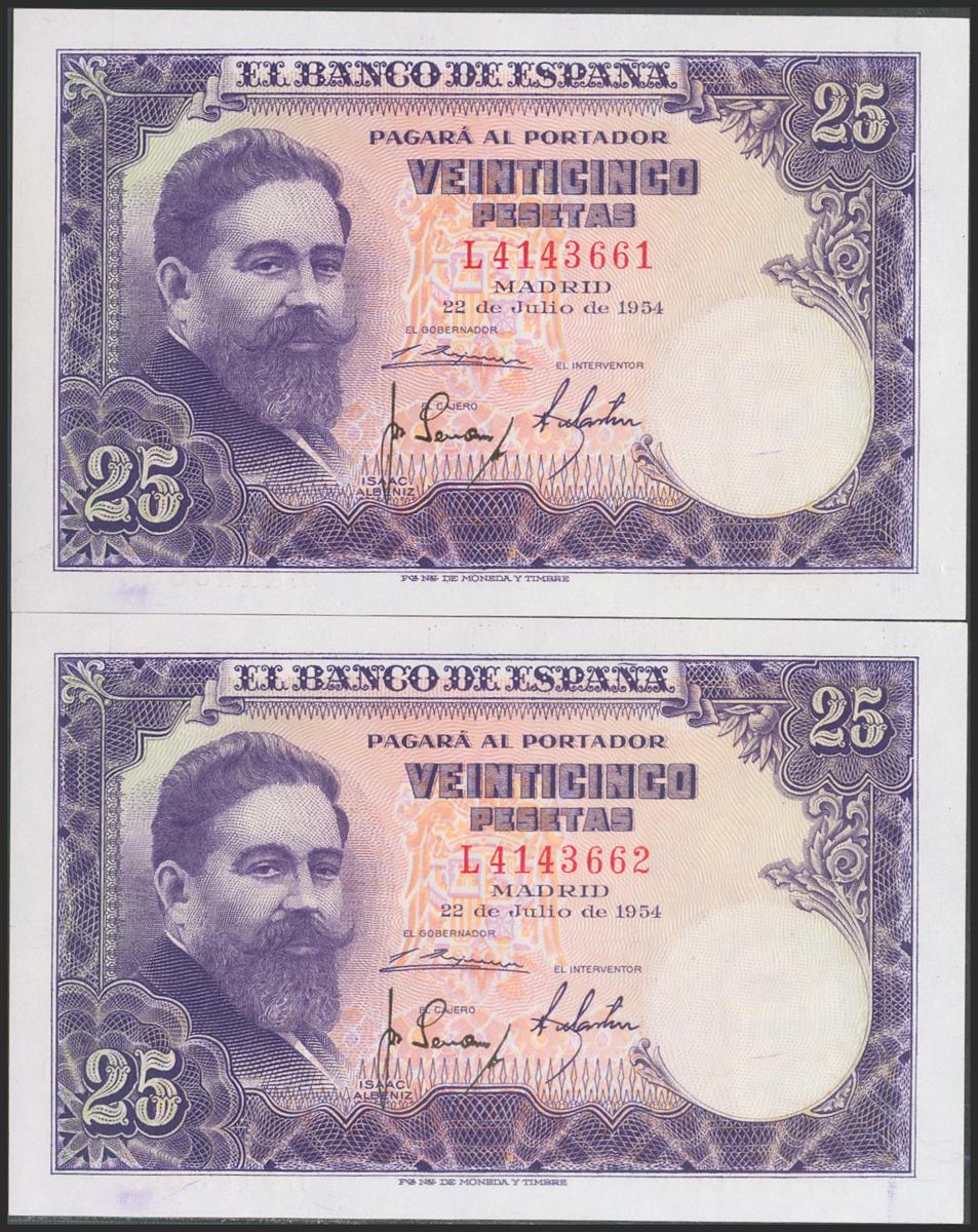 English 25 Pesetas. July 22, 1954. Correlative couple. Series L. (Edifil 2017: 467a). Uncirculated.
