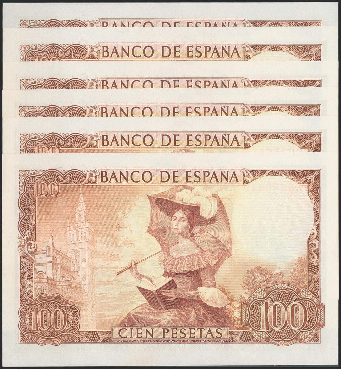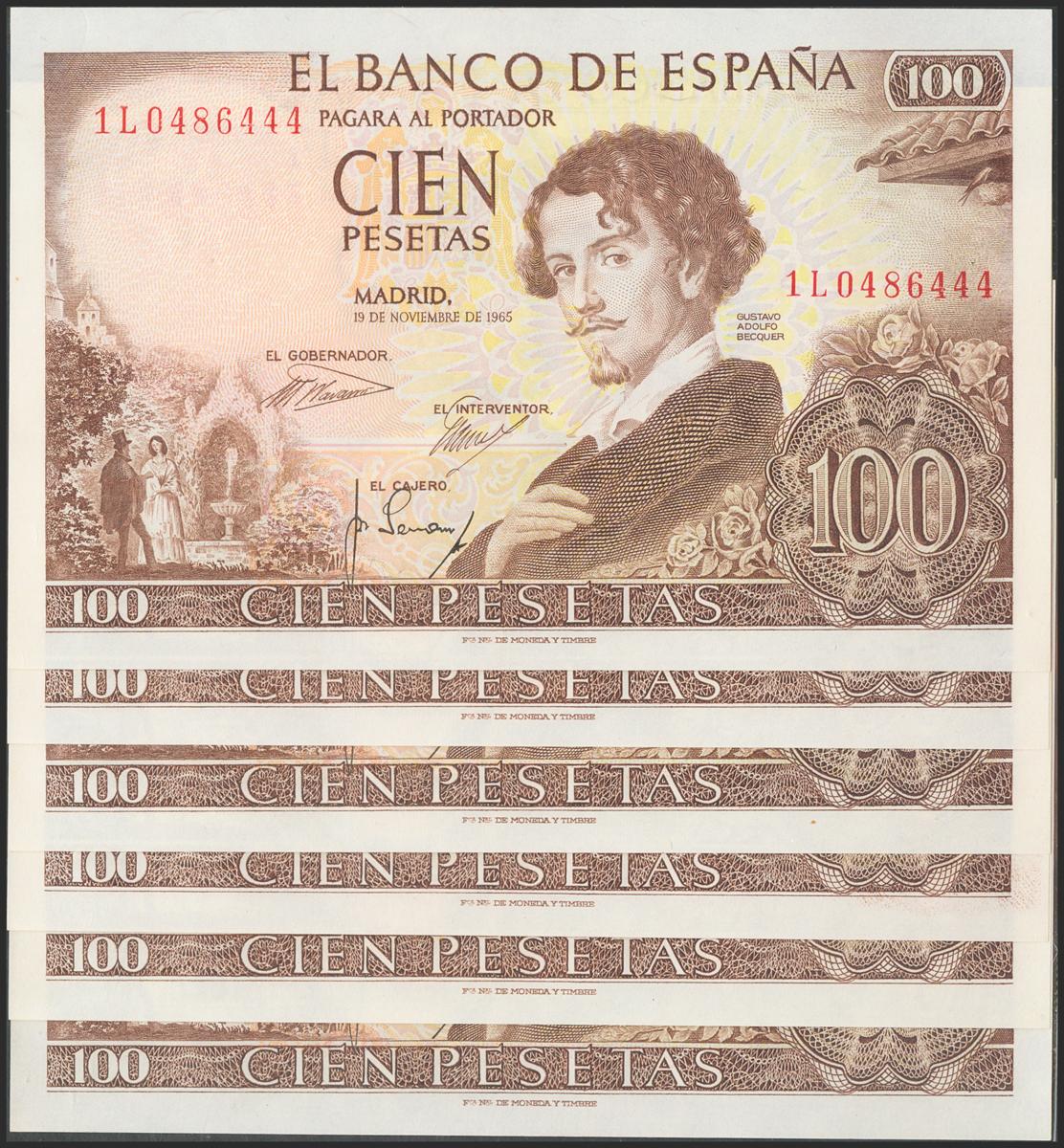 Set of 6 banknotes of 100 Pesetas issued on November 19, 1965 with the series 1L. (Edifil 2017: 470a). All with original sizing. Uncirculated.