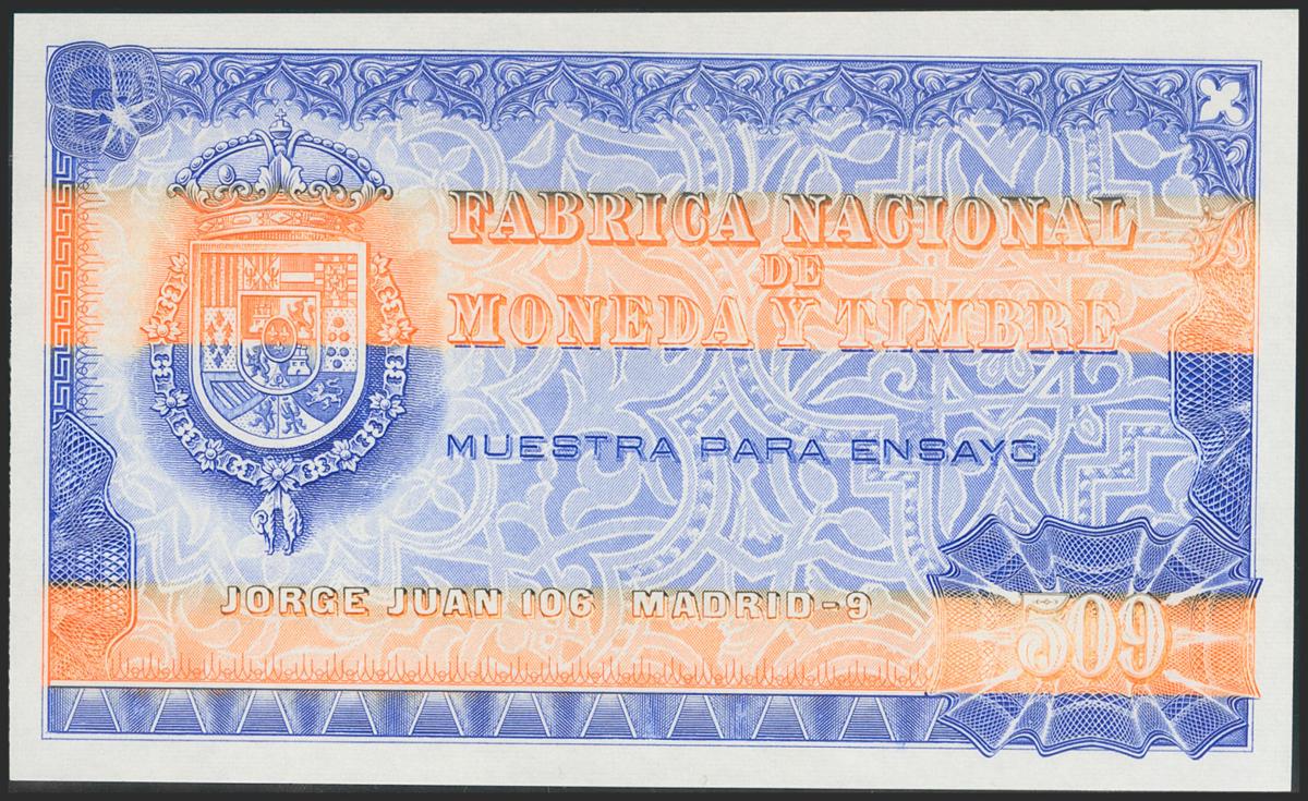 (1970ca). "Sample for Testing", with number 509, made at the FNMT and only the front and in blue / orange. Very rare. Uncirculated.
