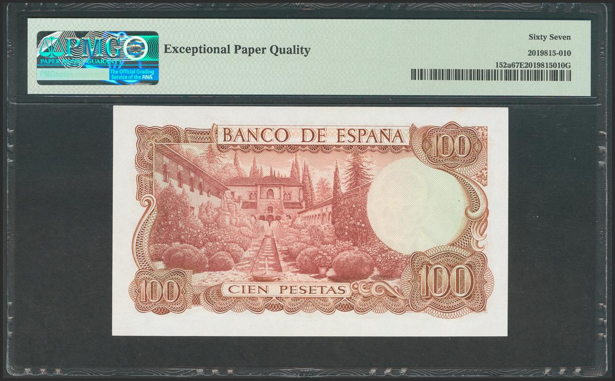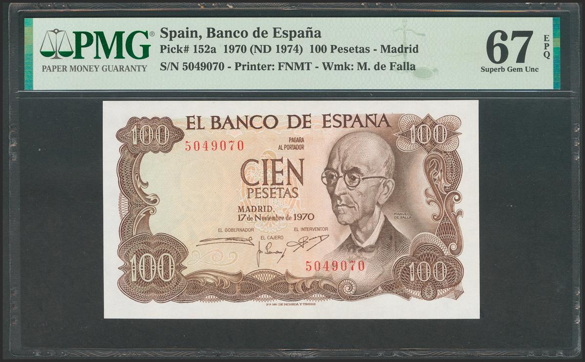 100 pesetas. November 17, 1970. Without series. (Edifil 2021: 472). Unusual in this quality, original sizing. Uncirculated. PMG67EPQ package.