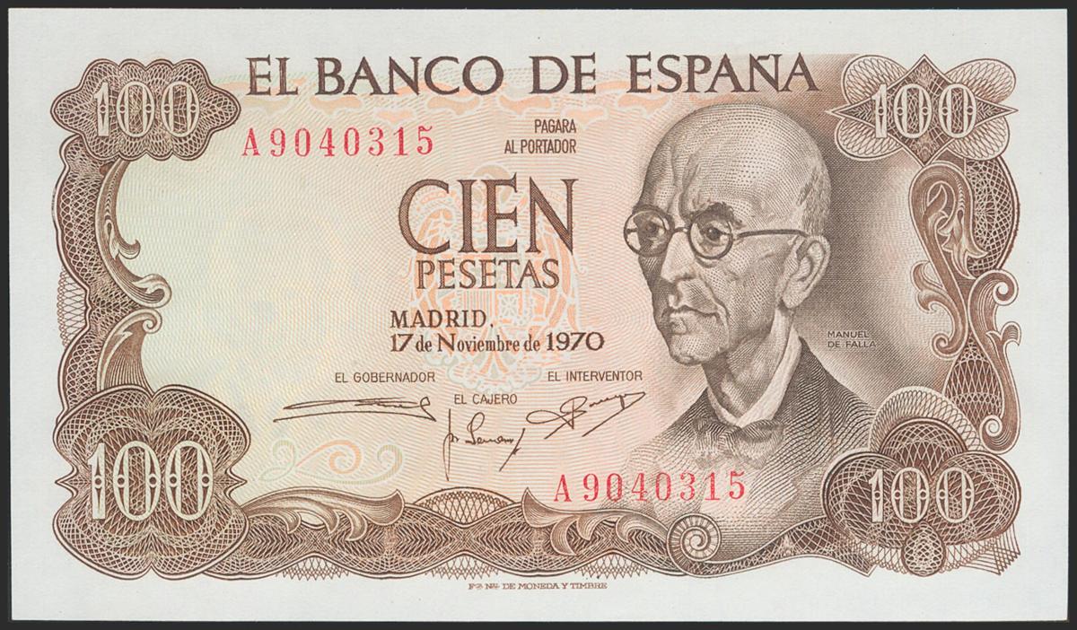100 pesetas. November 17, 1970. Series A. (Edifil 2021: 472a). Uncirculated.
