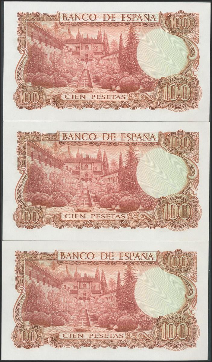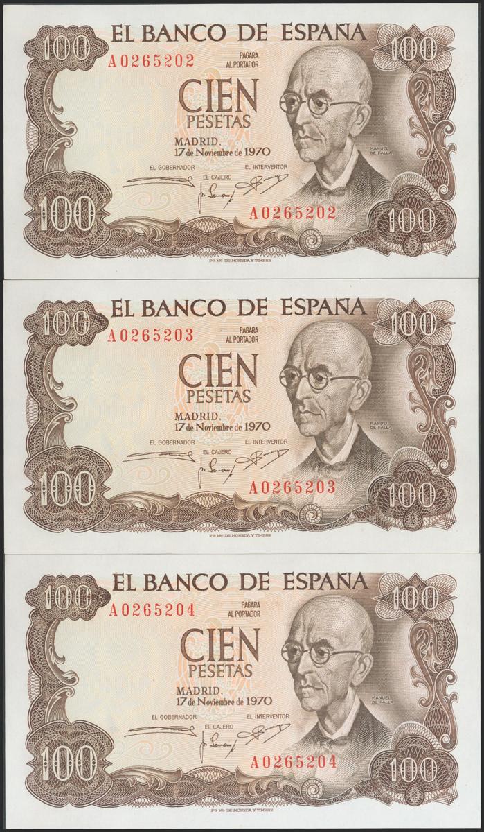 100 pesetas. November 17, 1970. Correlative trio. Series A. (Edifil 2017: 472a). Original sizing. Uncirculated.