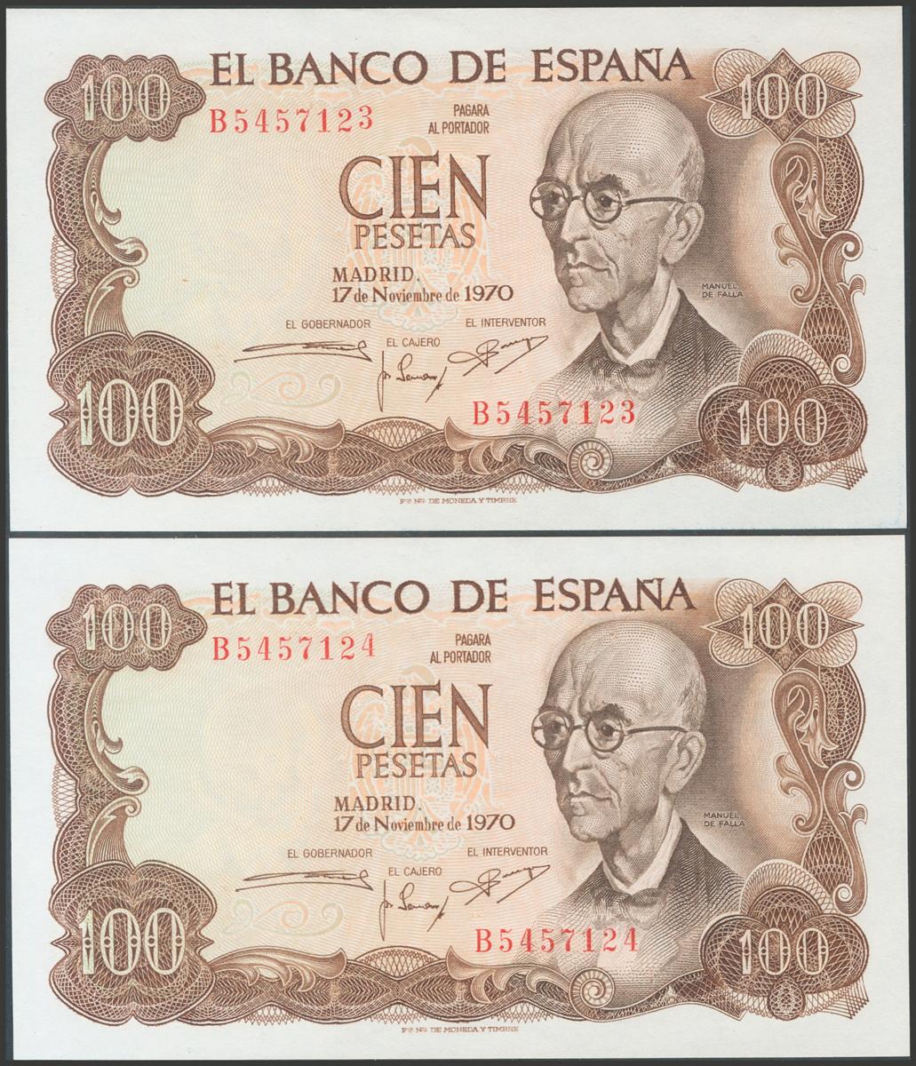 100 pesetas. November 17, 1970. Correlative pair. Series B. (Edifil 2017: 472b). Original sizing. Uncirculated.
