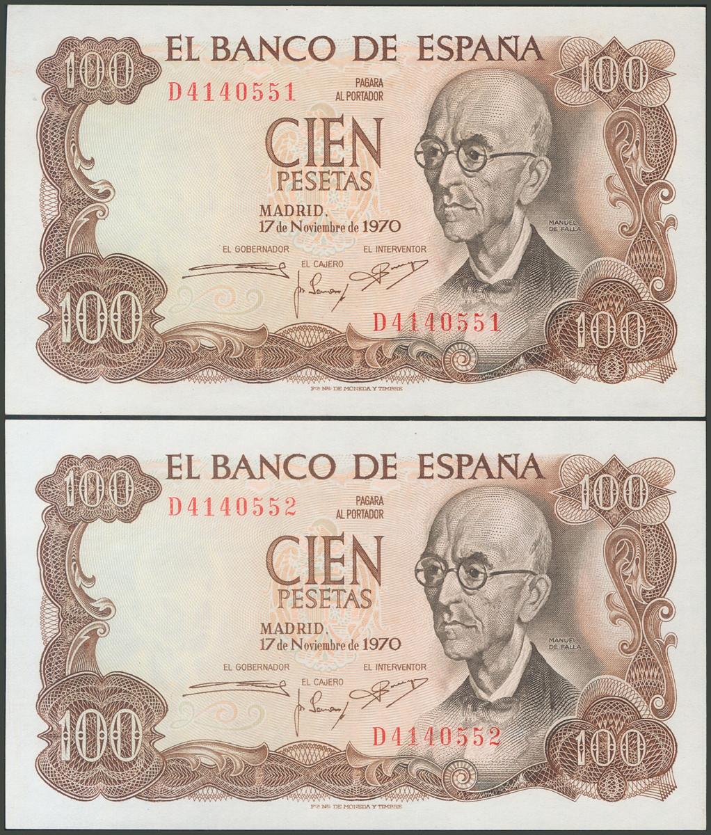 English 100 pesetas. November 17, 1970. Correlative pair. Series D. (Edifil 2017: 472b). Original sizing. Uncirculated.