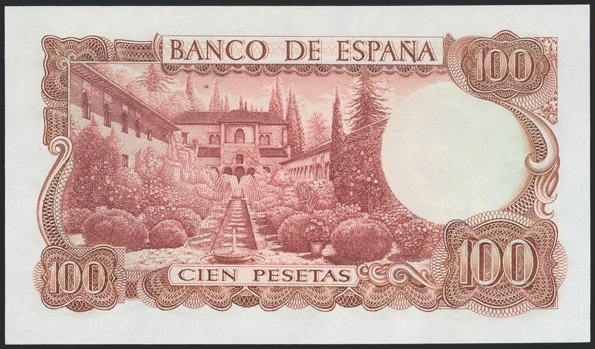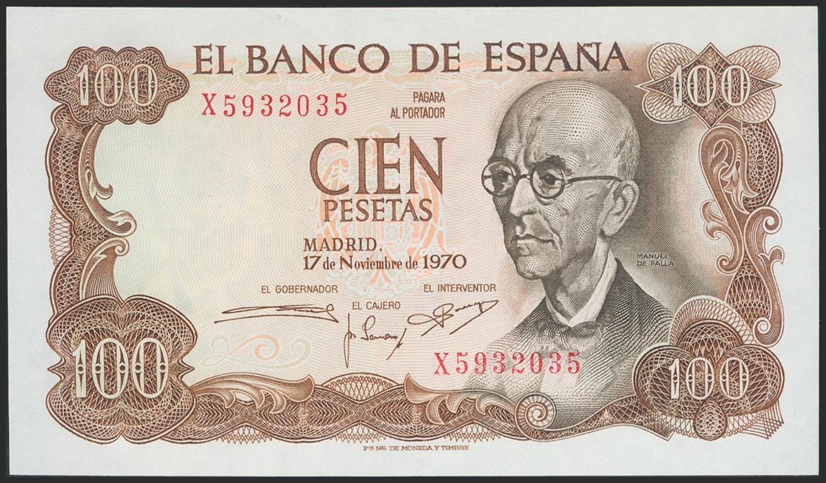 English 100 pesetas. November 17, 1970. Series X. (Edifil 2021: 472b). Original sizing. Almost Uncirculated.
